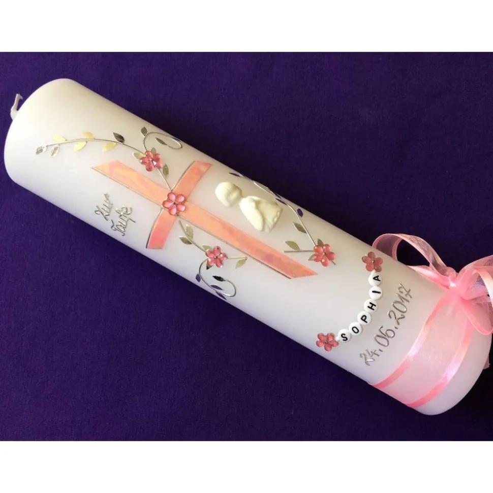 Taufkerze Kreuz mit hochwertigen Wachsverzierungen und Beschriftung aus Buchstabenperlen