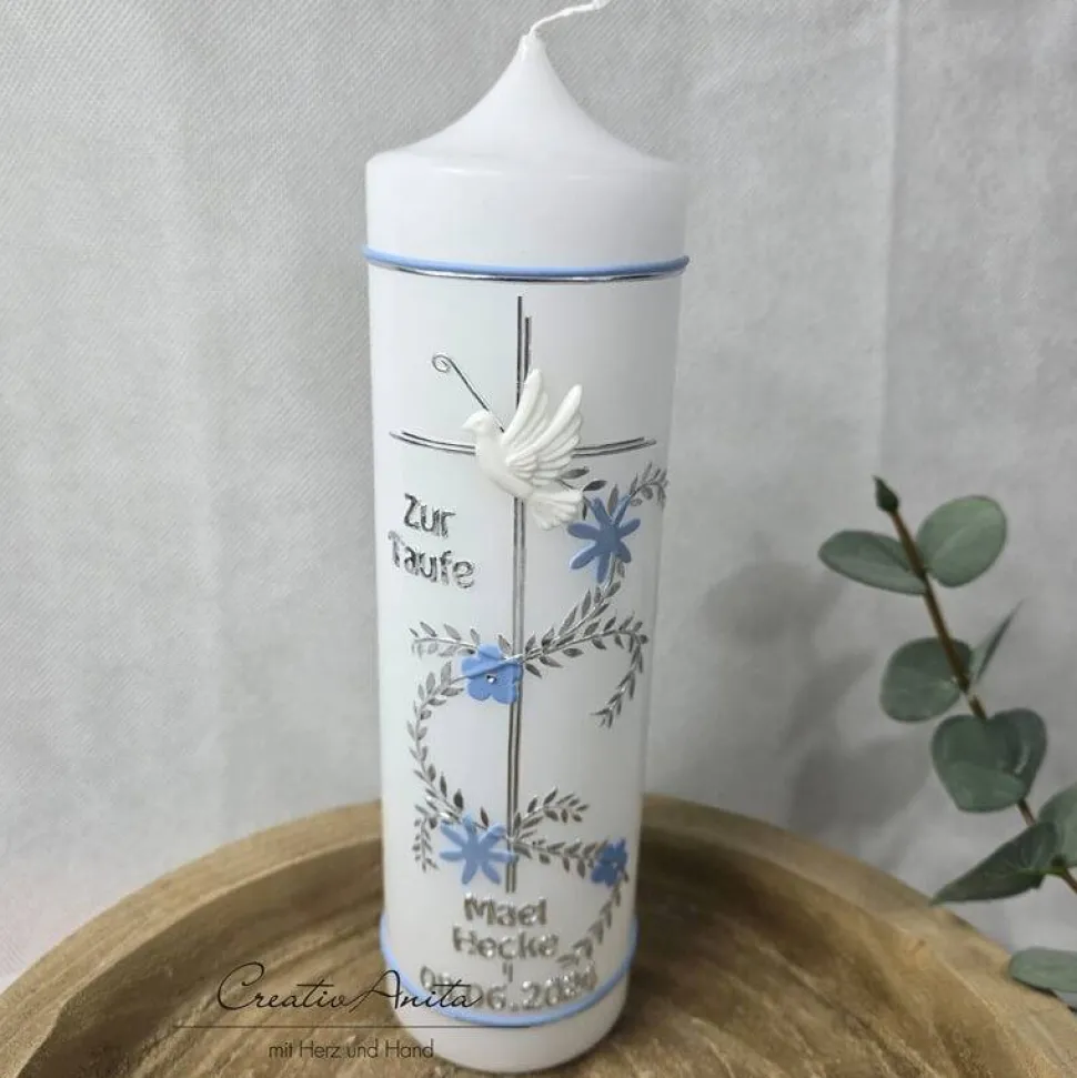 Gerne personalisieren wir die Kerze auch mit dem Namen des Täuflings und das Taufdatum. Bitte teilen Sie uns dies entsprechend mit.