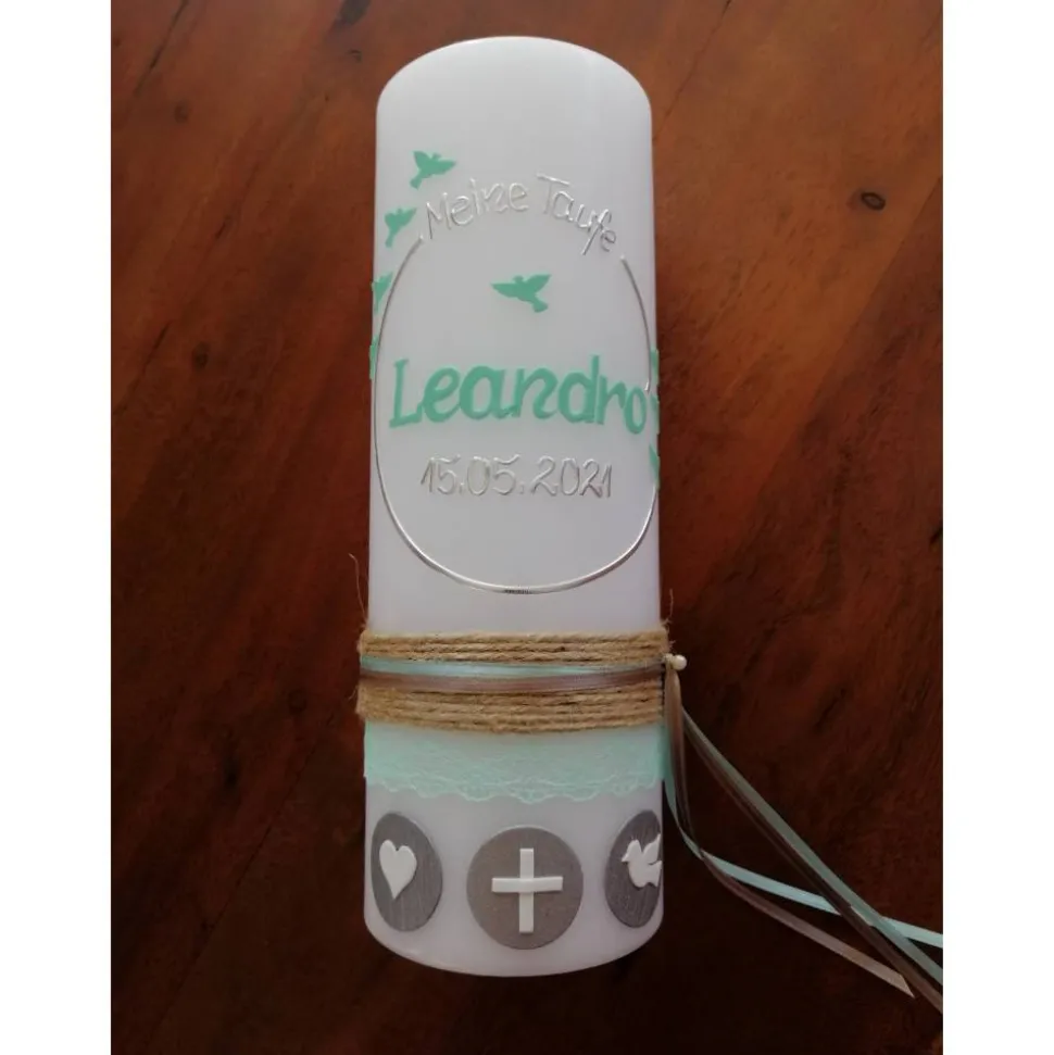 Die Taufkerze kann Ihren Wünschen entsprechend beschriftet werden.