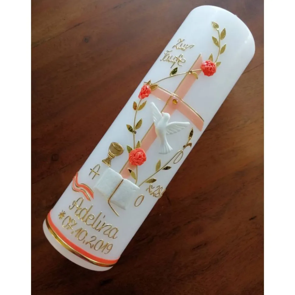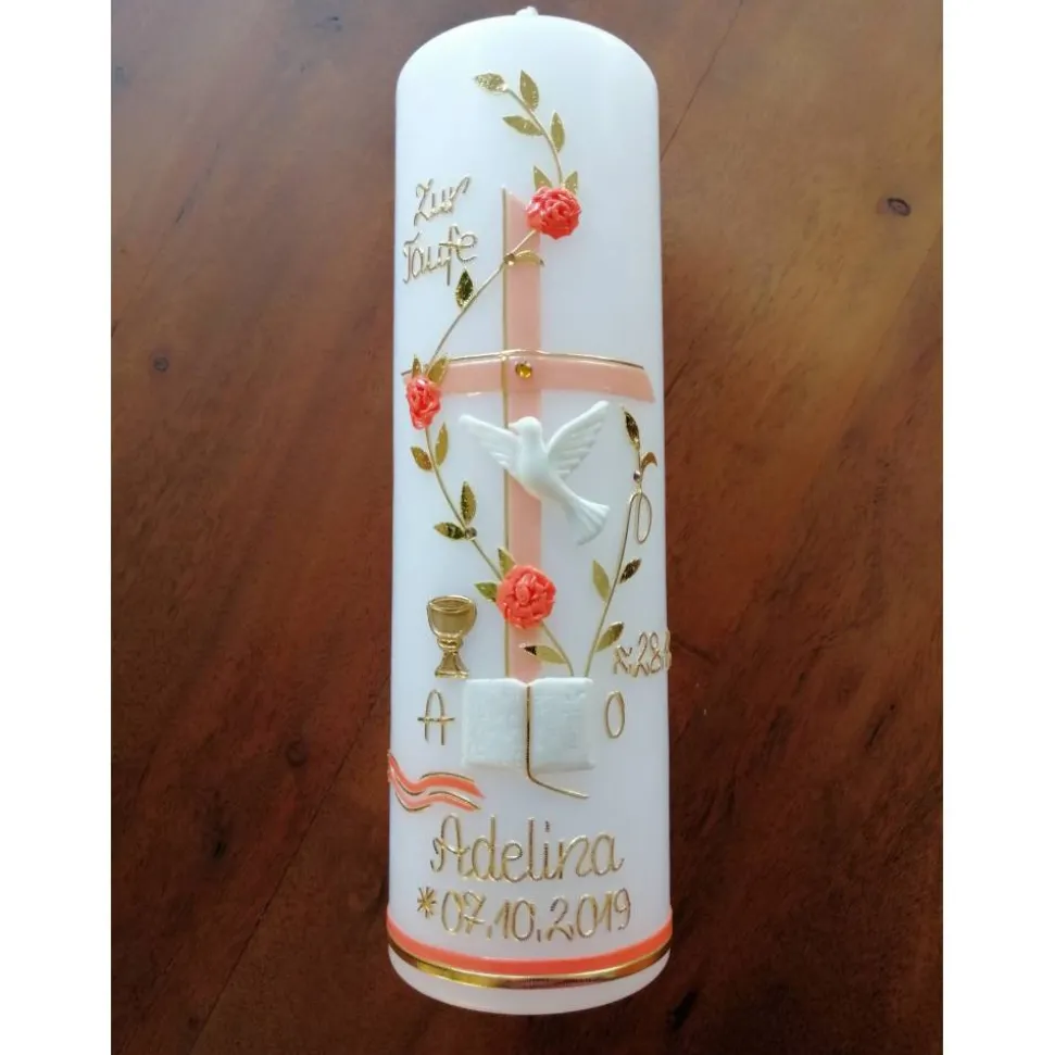 Taufkerze Kreuz Ranke Taube Kelch mit hochwertigen Wachsverzierungen