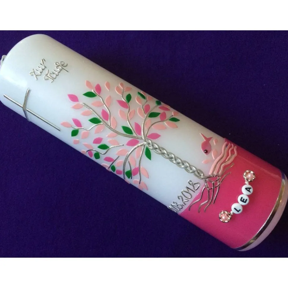 Taufkerze Lebensbaum mit hochwertigen Wachsverzierungen und Beschriftung aus Buchstabenperlen