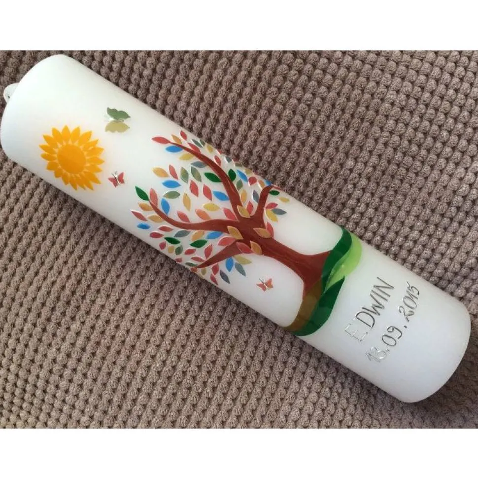 Taufkerze Lebensbaum mit hochwertigen Wachsverzierungen