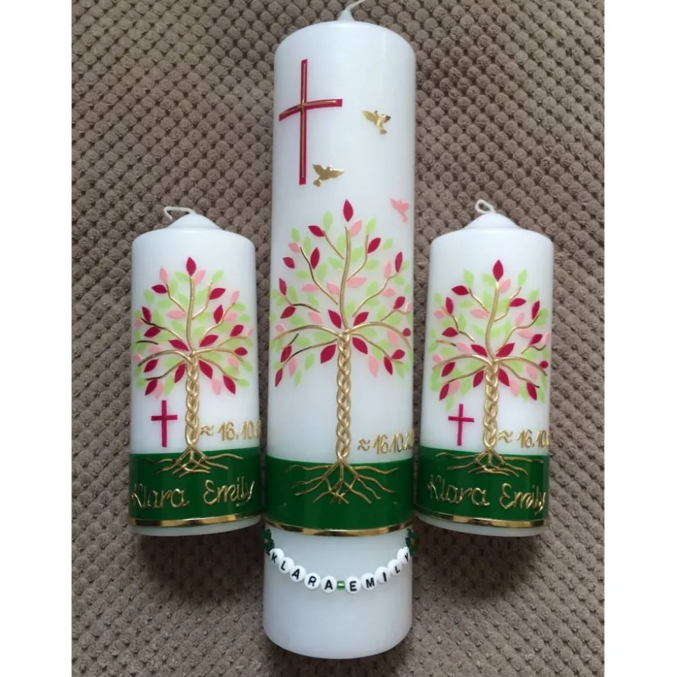 Die Taufkerze Lebensbaum ist 30 x 7 cm groß. Die Patenkerzen sind 2 x 15 x 6 cm groß.