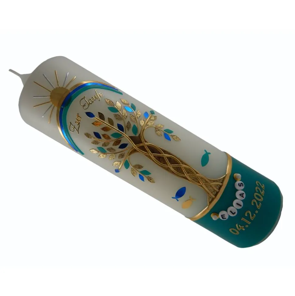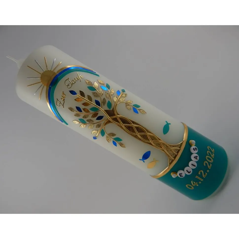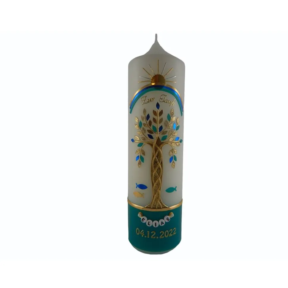 Taufkerze Mädchen Lebensbaum grün gold Baum des Lebens Regenbogen Namenskette Name Datum Spruch individualisierbar