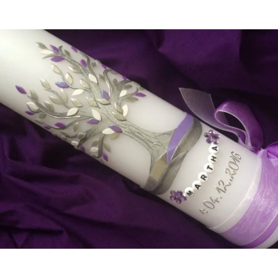 Taufkerze Lebensbaum mit hochwertigen Wachsverzierungen und Beschriftung aus Buchstabenperlen
