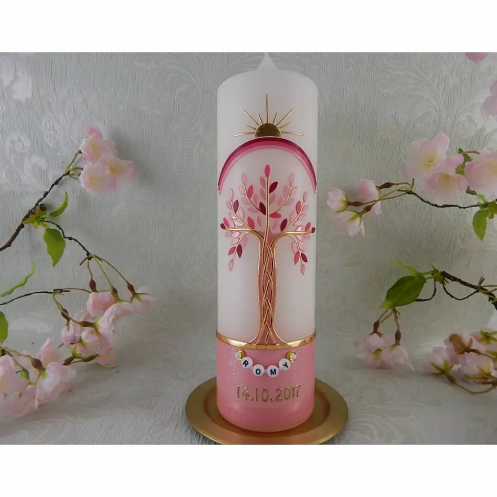 Taufkerze Mädchen Lebensbaum rosa gold Baum des Lebens Regenbogen Namenskette Name Datum Spruch individualisierbar