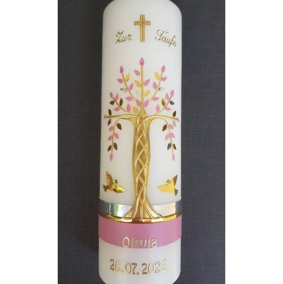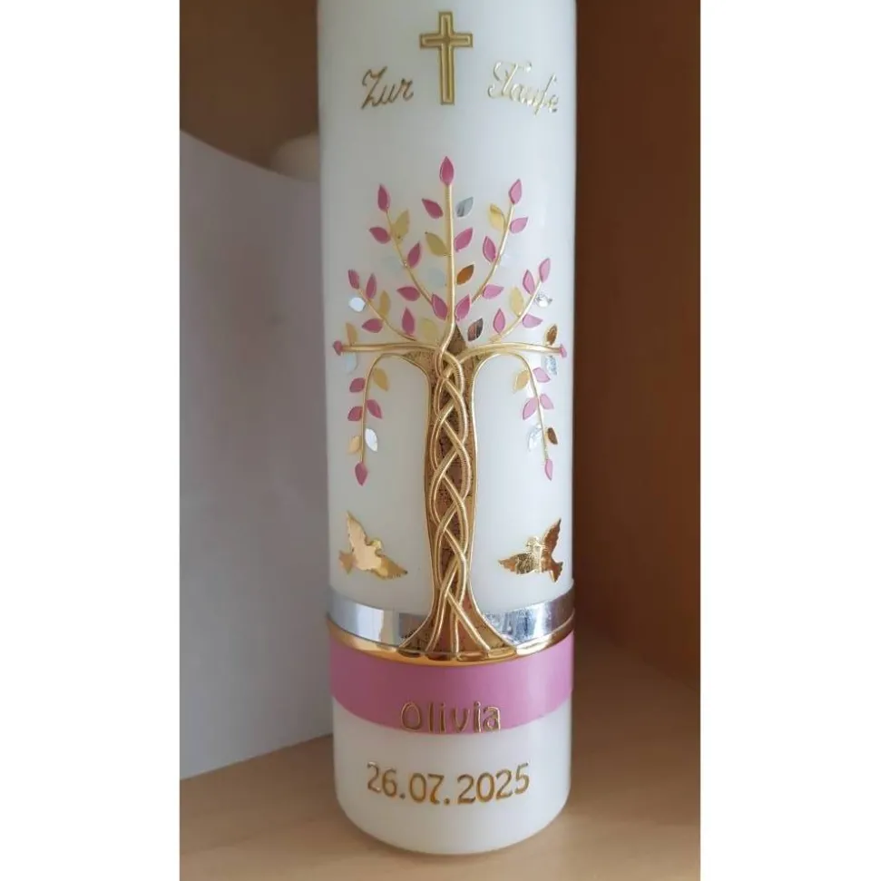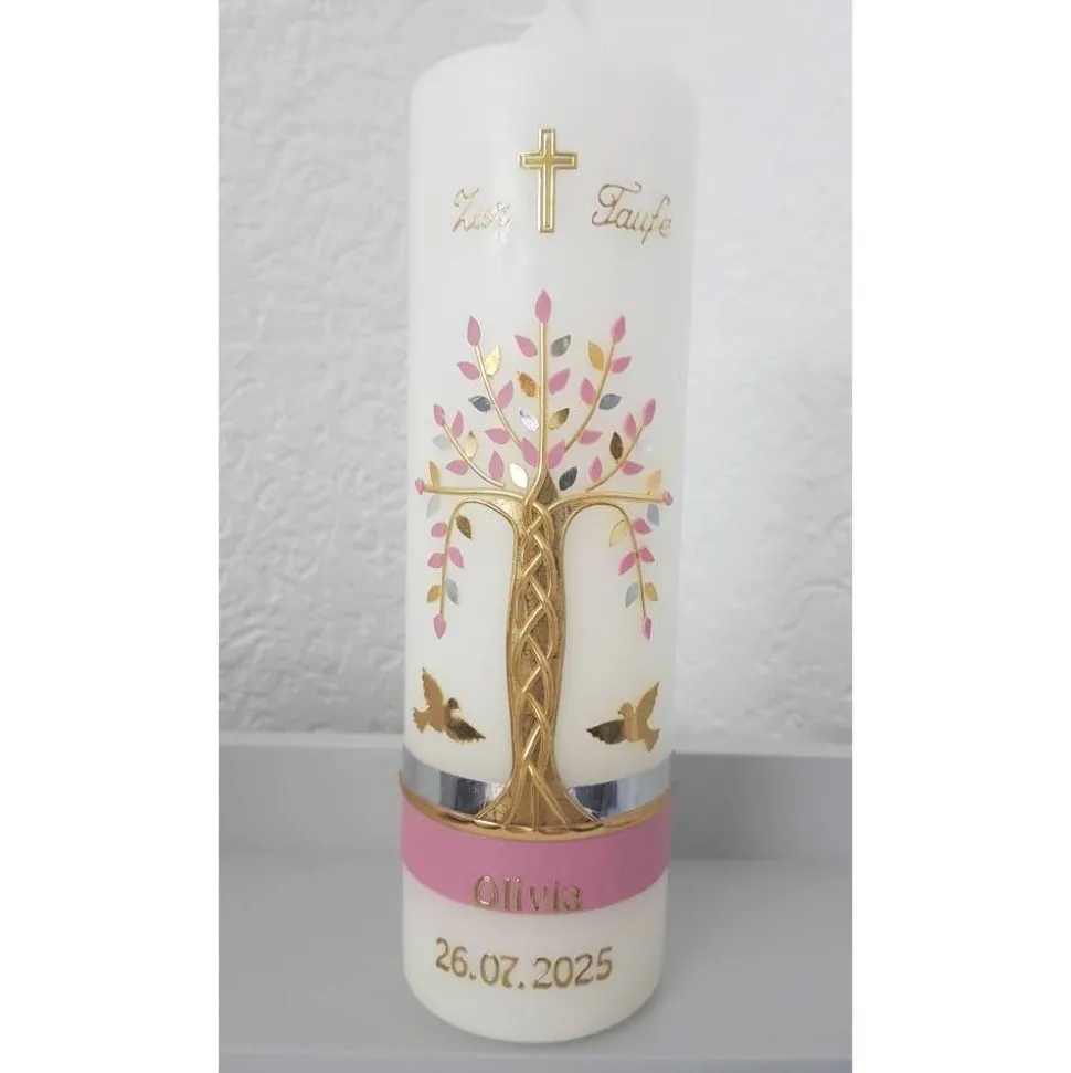 Taufkerze Mädchen Lebensbaum rosa gold silberBaum des Lebens Regenbogen Namenskette Name Datum Spruch individualisierbar
