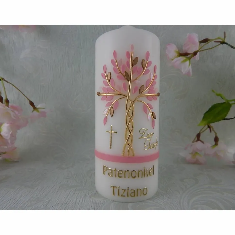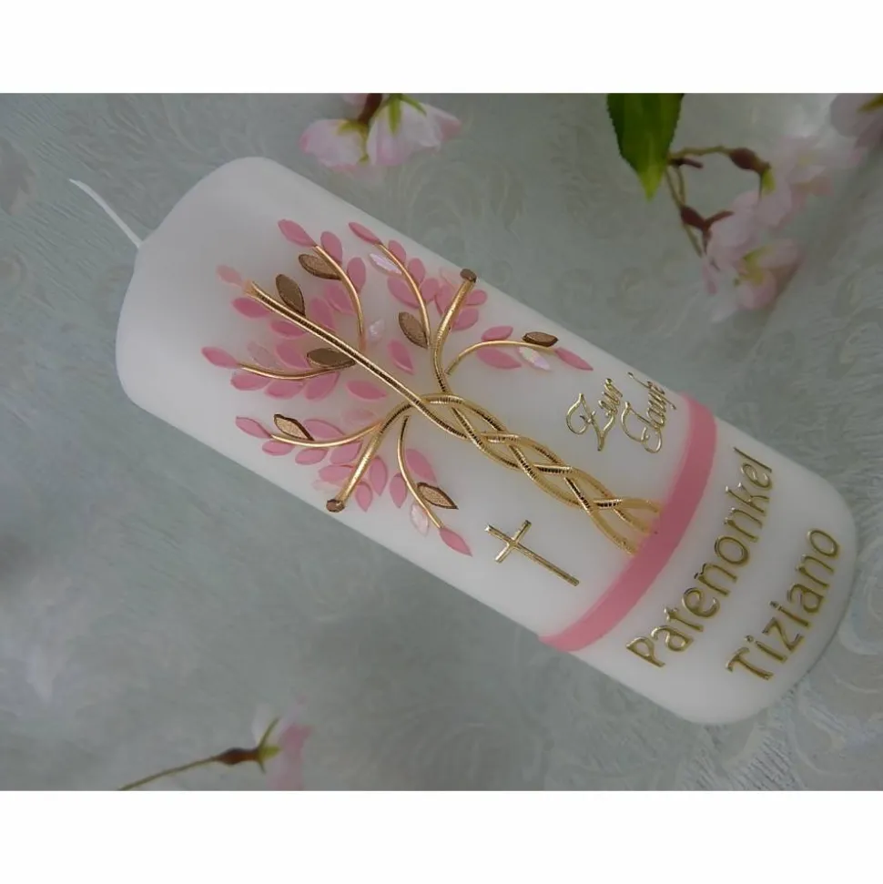Taufkerze Mädchen Lebensbaum rosa silber Baum des Lebens Fische Namenskette Name Datum Spruch individualisierbar