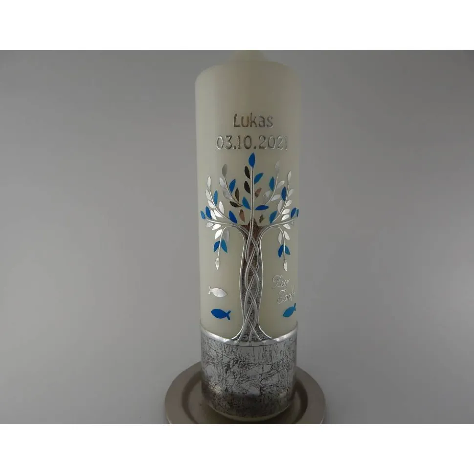 Taufkerze Mädchen Lebensbaum silber blau Baum des Lebens Regenbogen Namenskette Name Datum Spruch individualisierbar