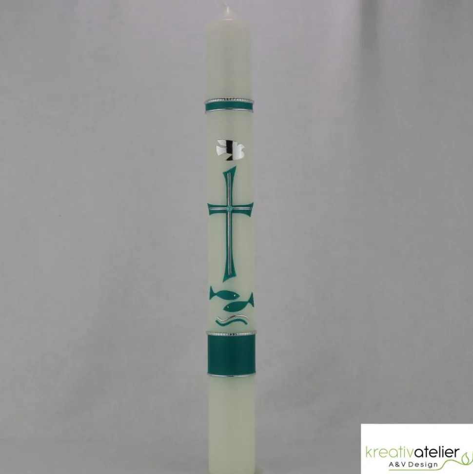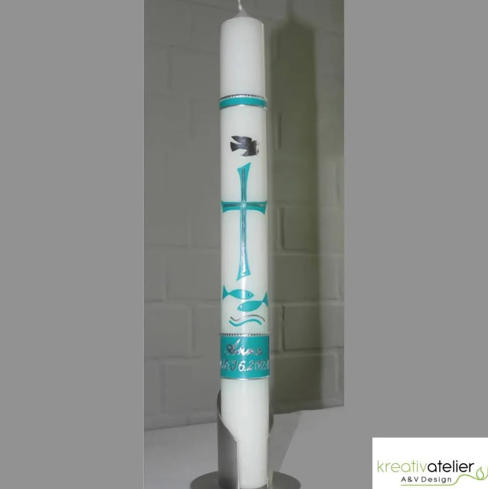 Liebevoll von Hand verzierte, aufwändige Taufkerze in elfenbein mit türkisem Byzantiner-Kreuz, türkisen Fischen, silberner Taube und weiteren Akzenten in silber. Im türkisen Band am unteren Ende ist Platz für Name und Taufdatum.