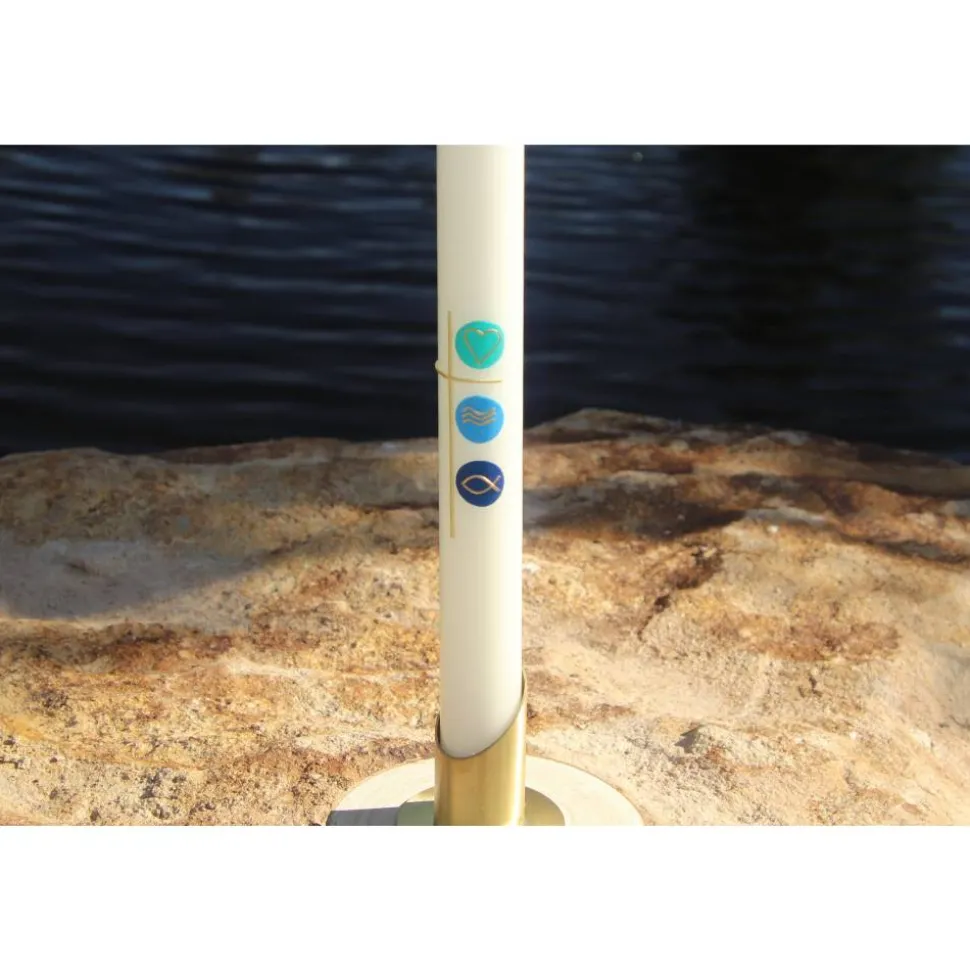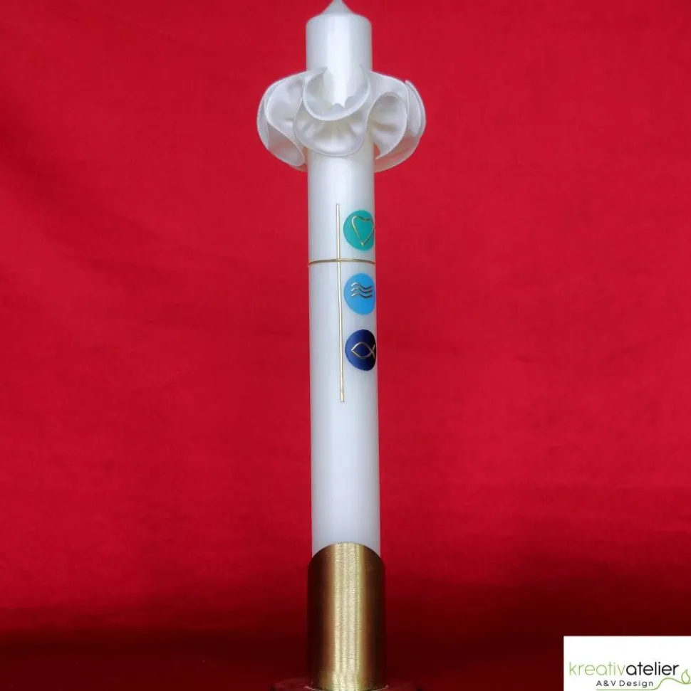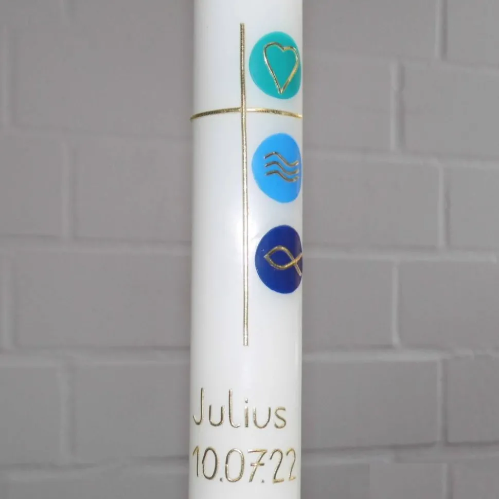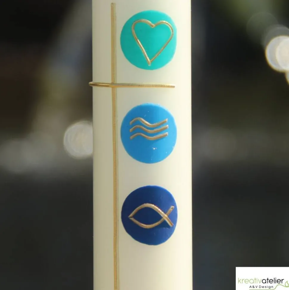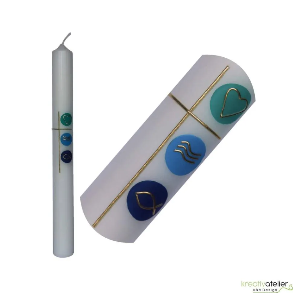 Schlicht und elegant von Hand verzierte Taufkerze in elfenbein mit drei Kacheln in verschiedenen Blau- und Türkistönen, die die christlichen Symbole in gold zeigen. Die Symbole werden mit einem feinen Goldstreifen von Hand auf die farbigen Kacheln aufgebracht. Die Kacheln wurden zuvor einzeln von Hand aus verschiedenen Wachsplatten ausgeschnitten. Beides zusammen wird kunstvoll zu einem Gesamtbild auf der Kerze arrangiert.