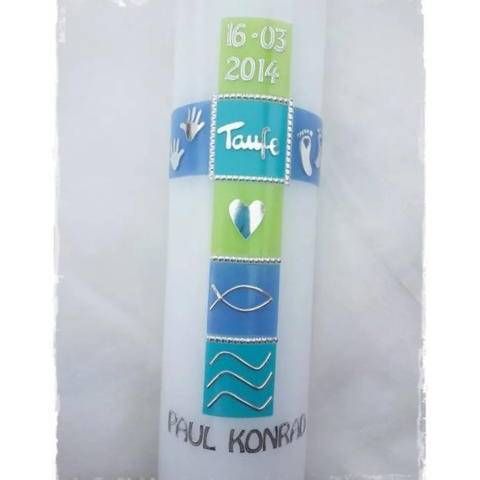 Das Motiv dieser Taufkerze ist aus Wachs gefertigt, für Name und Datum verwenden wir Konturensticker.