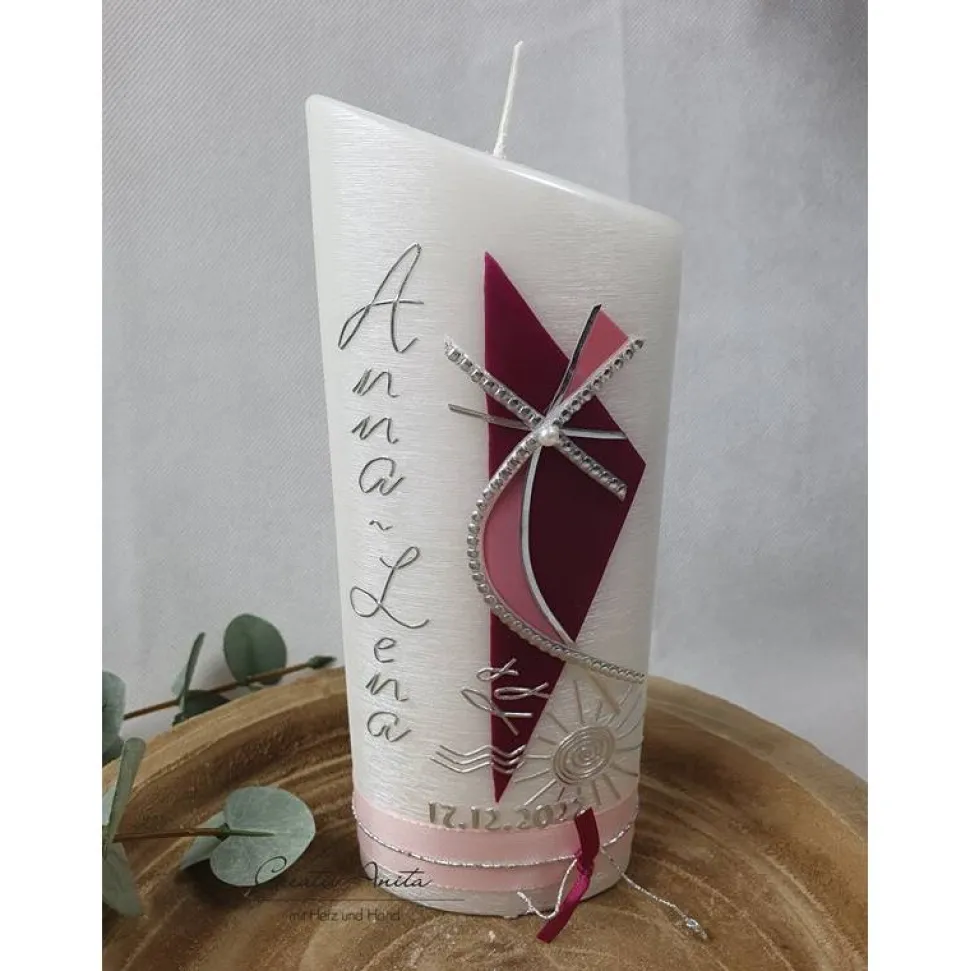 Gerne personalisieren wir die Kerze auch mit Namen und Datum mit Wachsbuchstaben in silber oder gold.