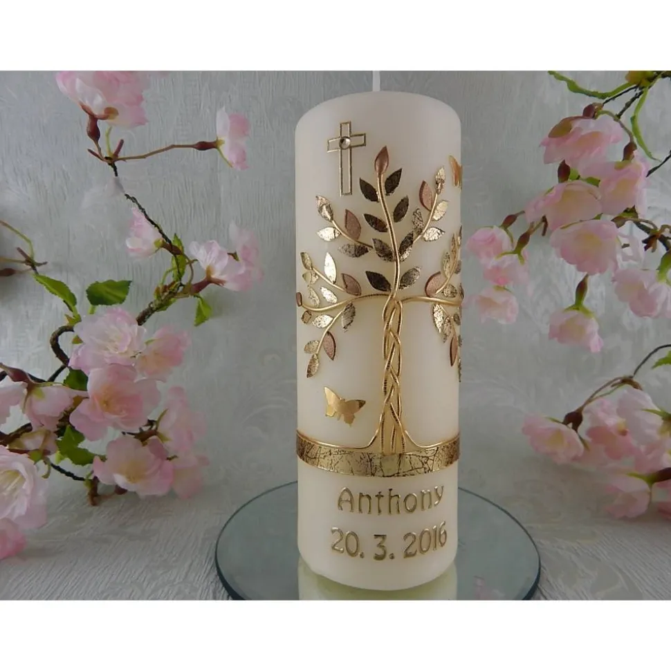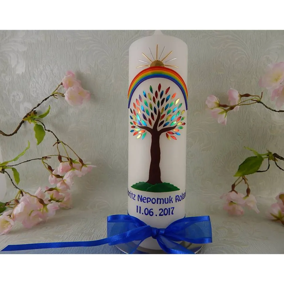 Taufkerze Mädchen Jungen Lebensbaum bunt gold Baum des Lebens Sterne Namenskette Name Datum Spruch individualisierbar