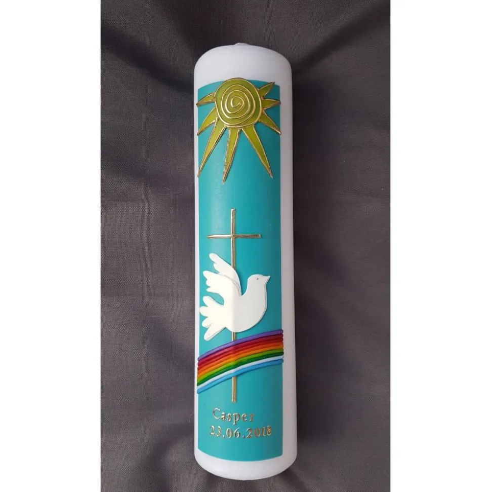 Ob gold oder silber Streifen, sowie das Motiv – hier abgebildet ist pastellgrün, weiße Taube, gelbe Sonne, Regenbogen