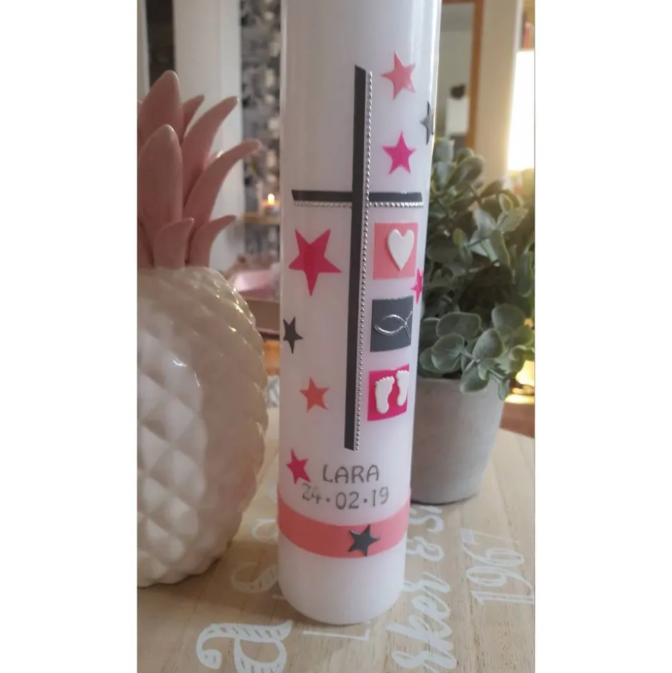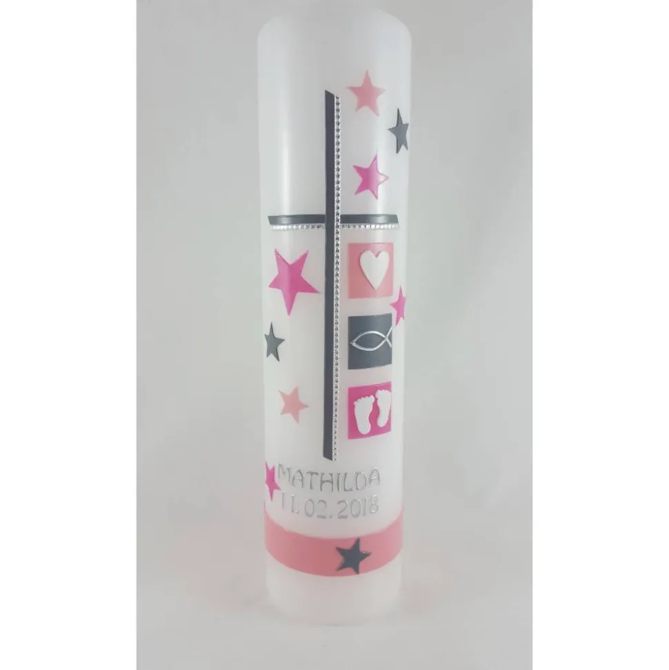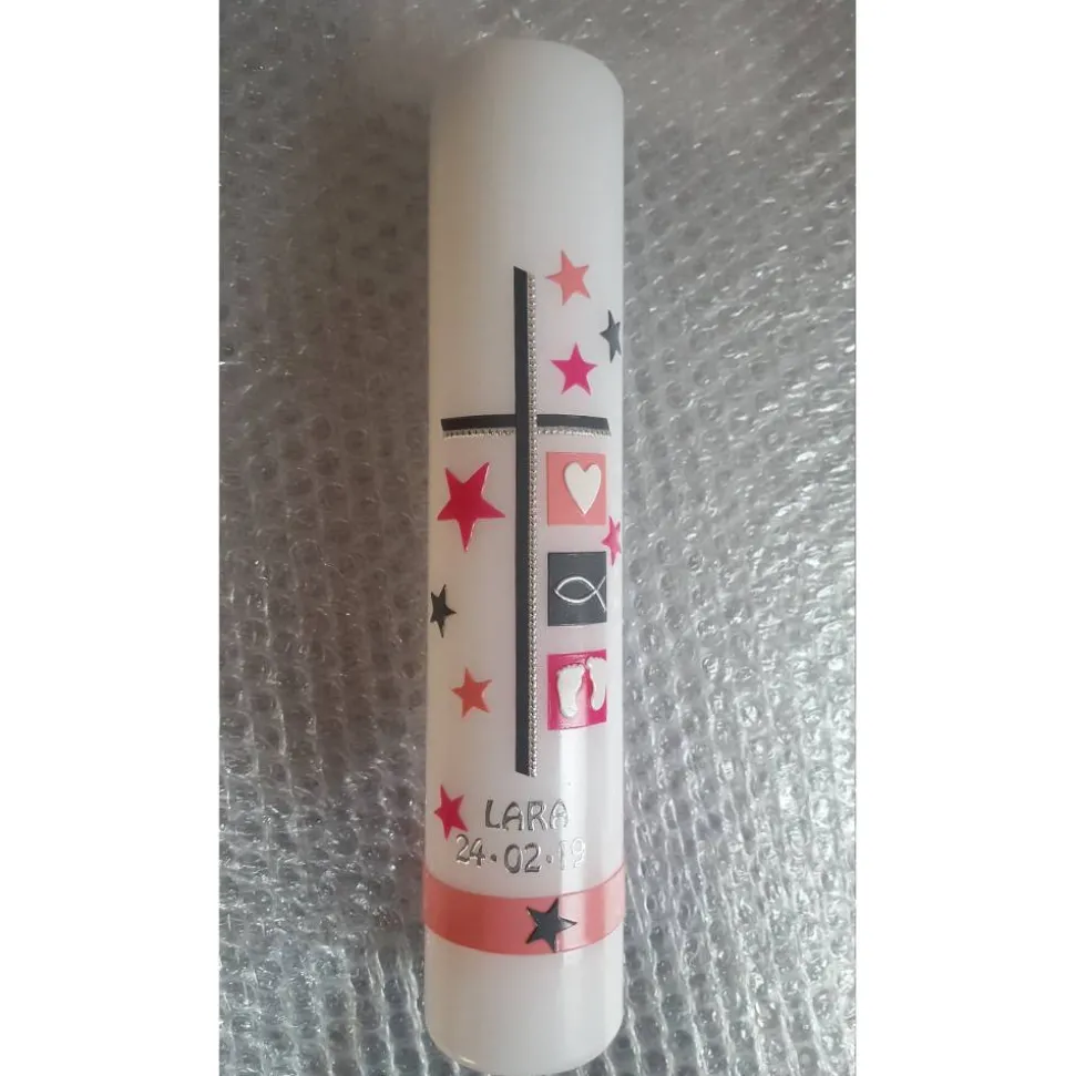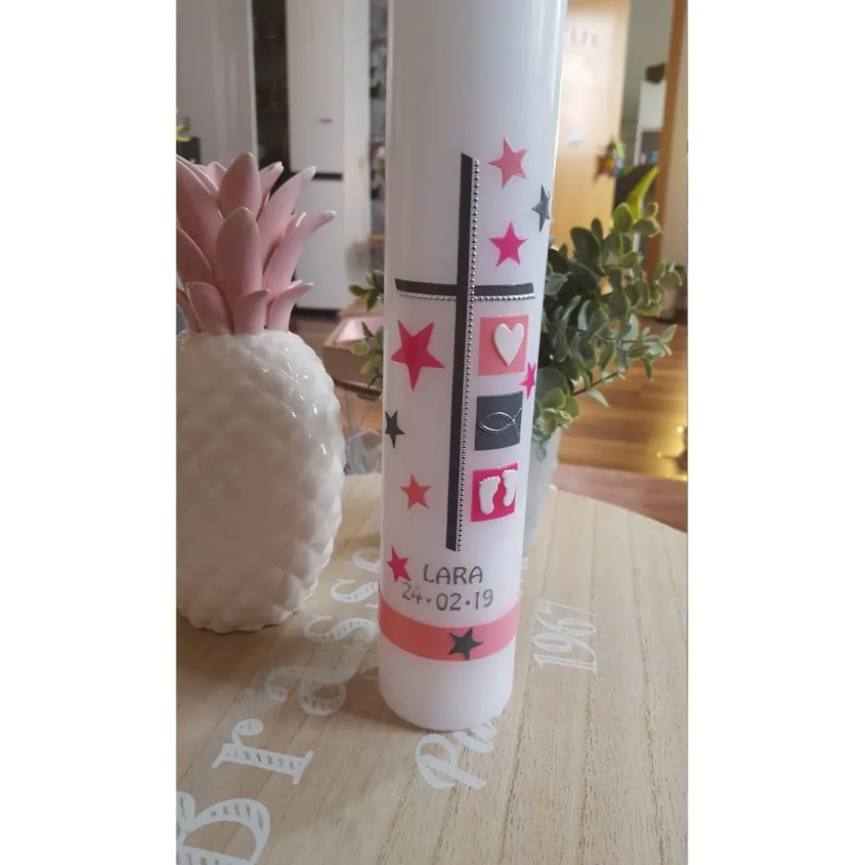 Die Sterne geben der Taufkerze ihren modernen Touch. Die Symbole können auf Wunsch geändert werden.