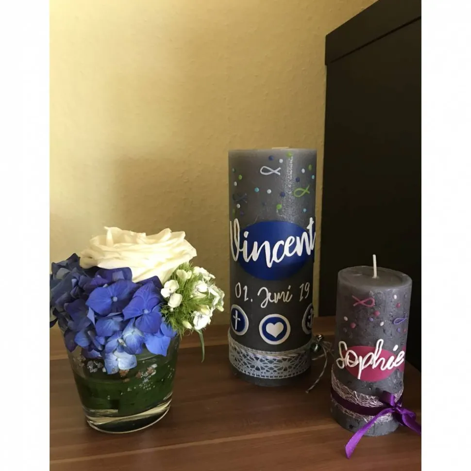 Liebevoll von Hand gestaltet, verziehrt mit Name und Tauf- oder Geburtsdatum.