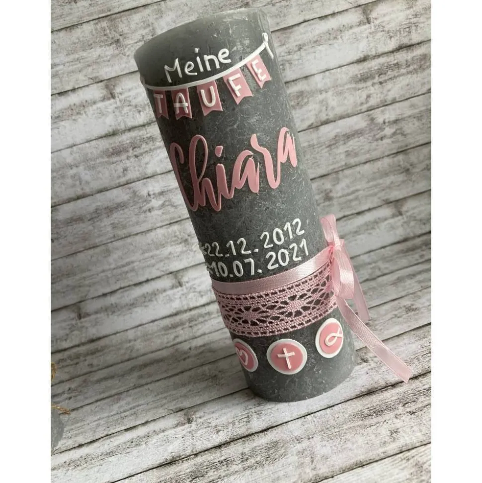 Liebevoll von Hand gestalltet, verziehrt mit Name und Tauf- oder Geburtsdatum.
