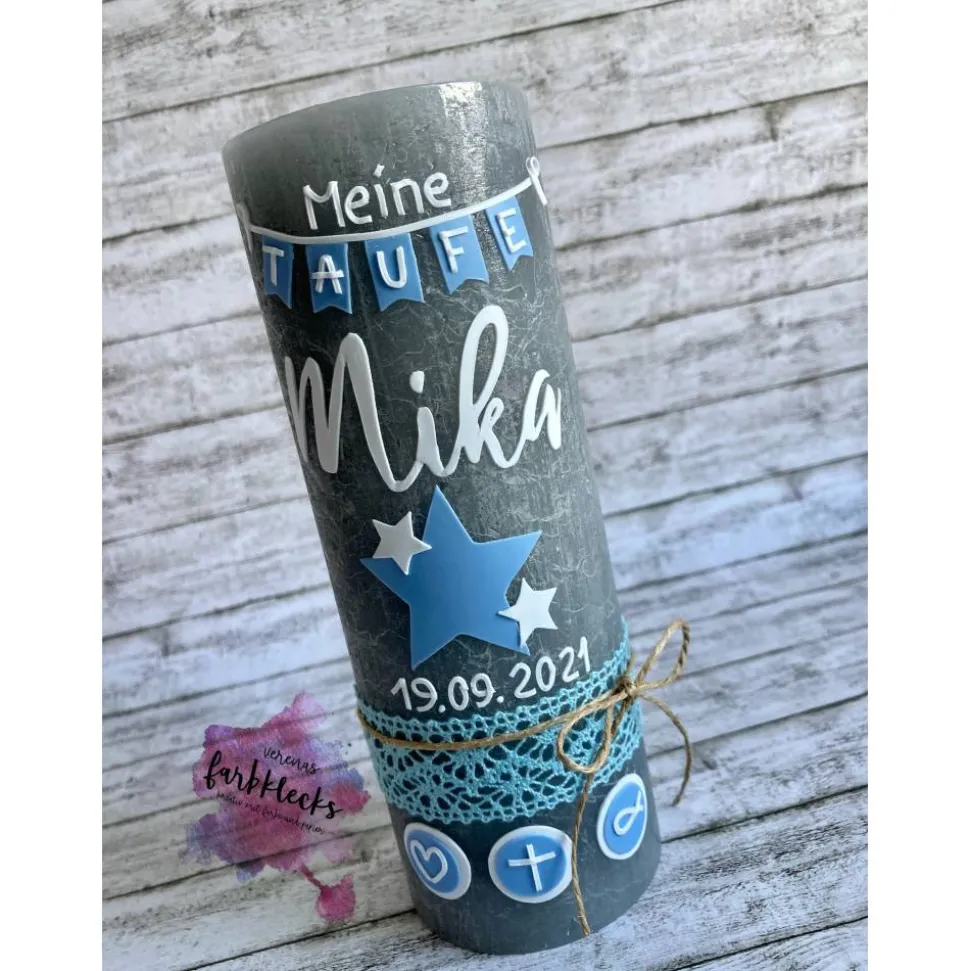 Liebevoll von Hand gestalltet, verziehrt mit Name und Tauf- oder Geburtsdatum.