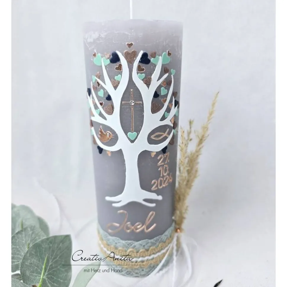 Handverzierte Kerze mit Lebensbaum und Herzen. Im Lebensbaum befinden sich die Symbole Kreuz, Taube, Fisch.