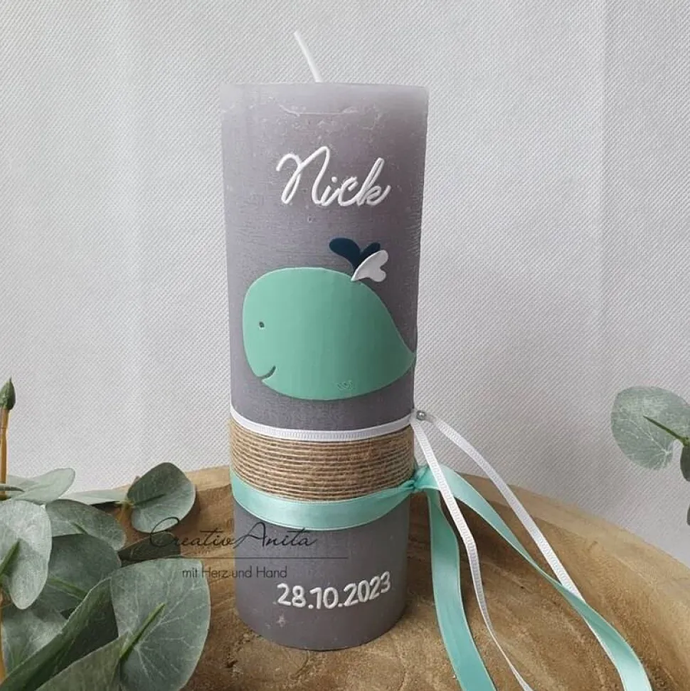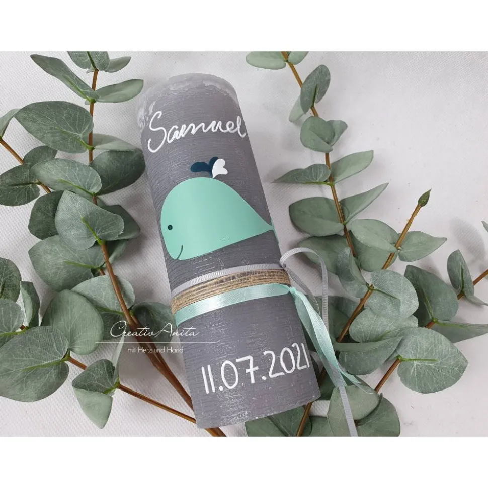 Handverzierte Kerze mit einem Wal – süßen kleinen Wasserspritzern – minimalistisch