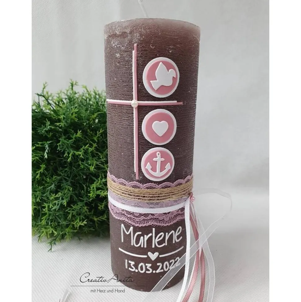 Handverzierte Kerze mit Kreuz und religiösen Symbolen in den Farben altrosa und weiß.