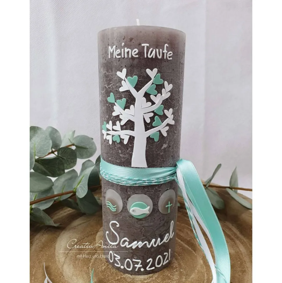 Gerne personalisieren wir die Kerze auch mit dem Namen des Täuflings und das Taufdatum.