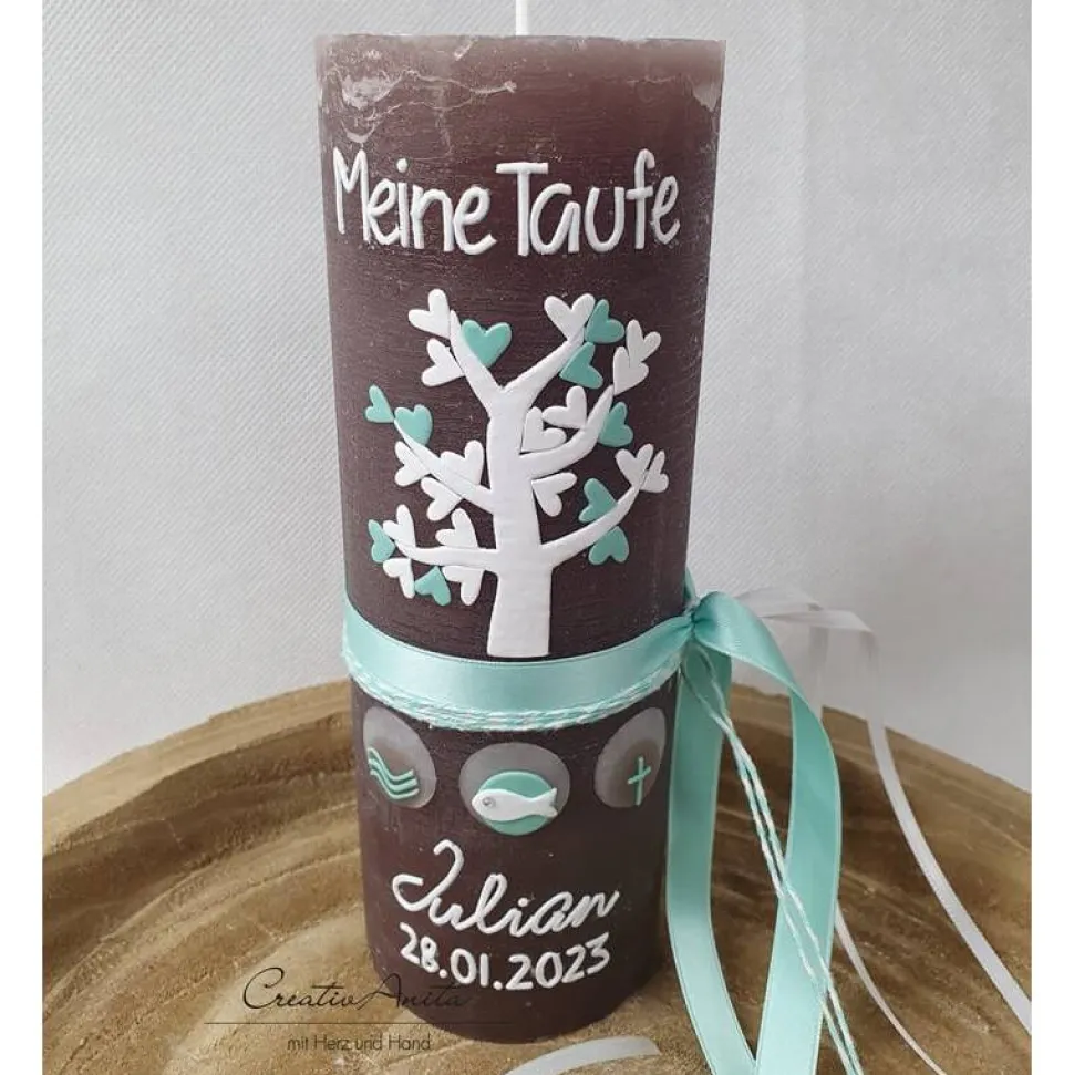Tolle Taufkerze – Erinnerungskerze Sternenkind – Rustikkerze in Schlamm – Taupe – Braun!