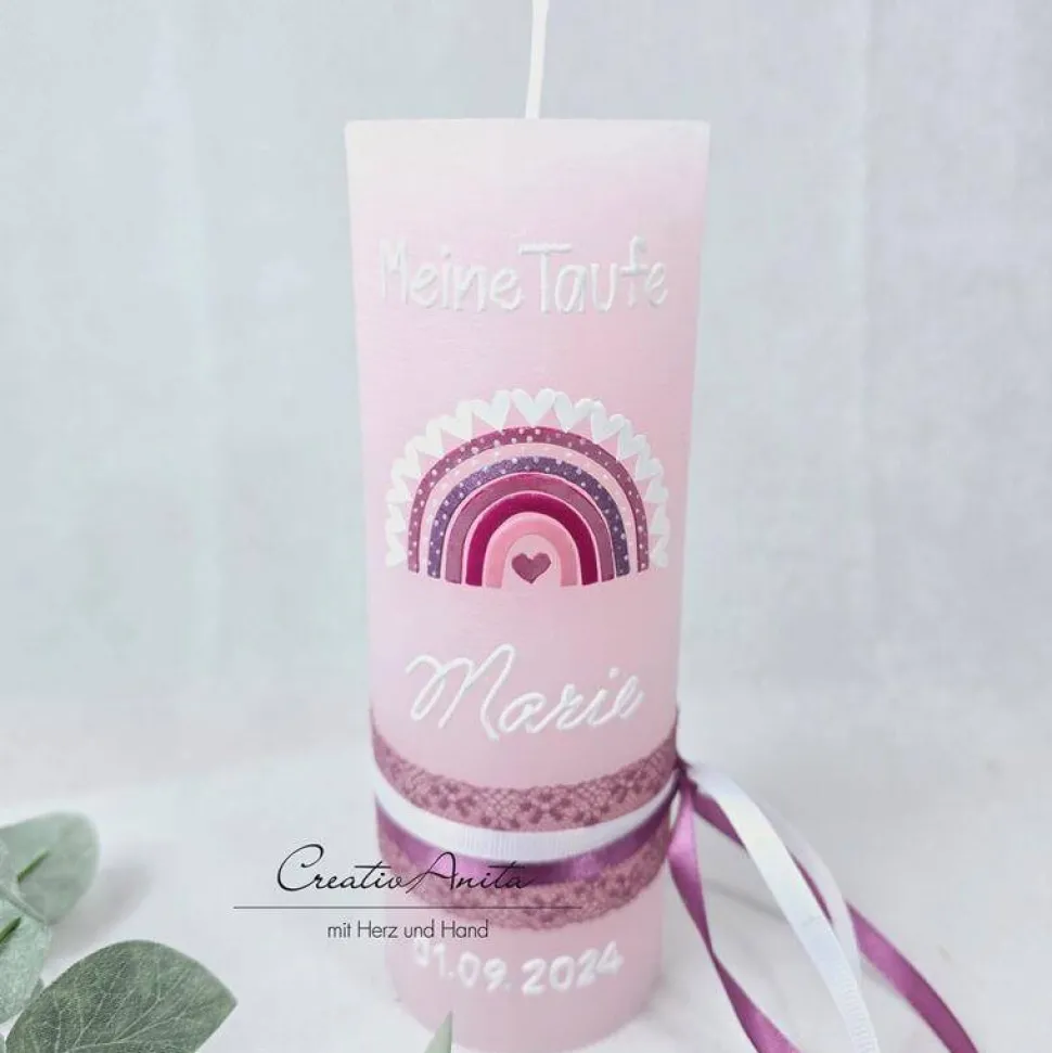 Tolle Taufkerze – Rustikkerze in Rosé mit trendigem Regenbogen aus Herzen.