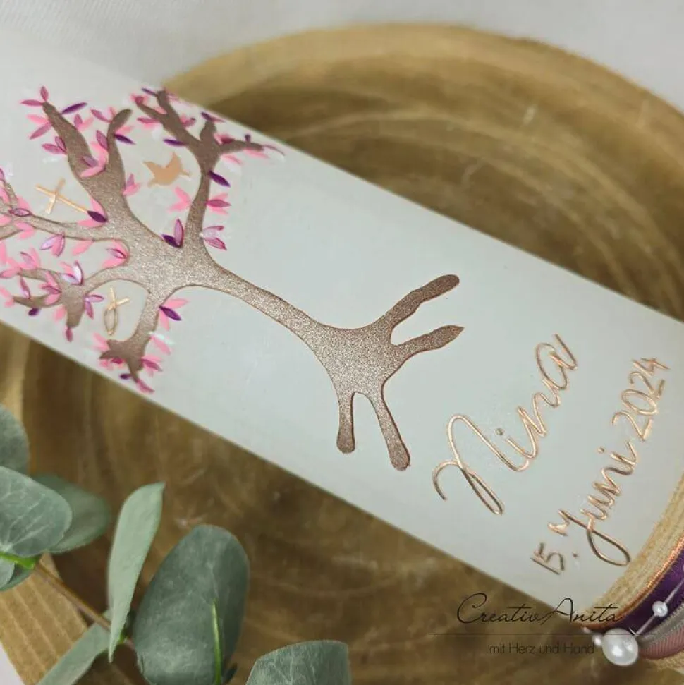Handverzierte Kerze mit Lebensbaum und christliche Symbole, die sich im Baum befinden (Fisch, Kreuz, Taube).