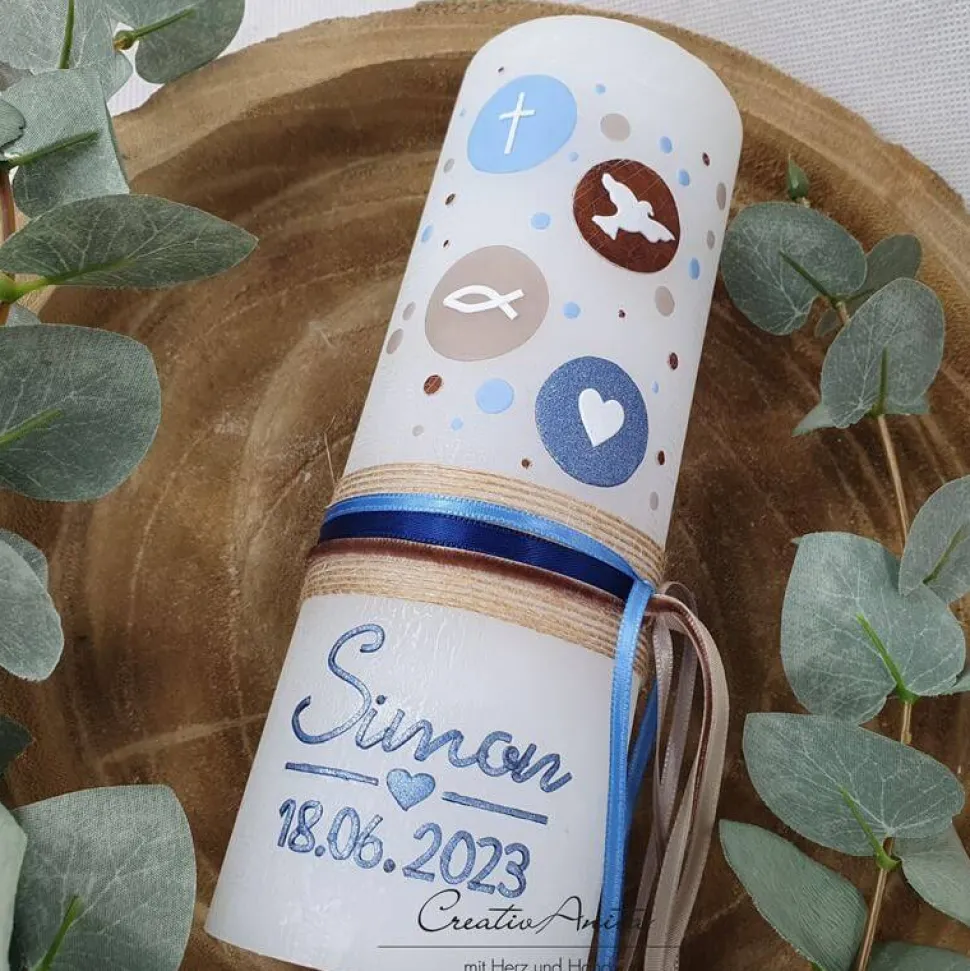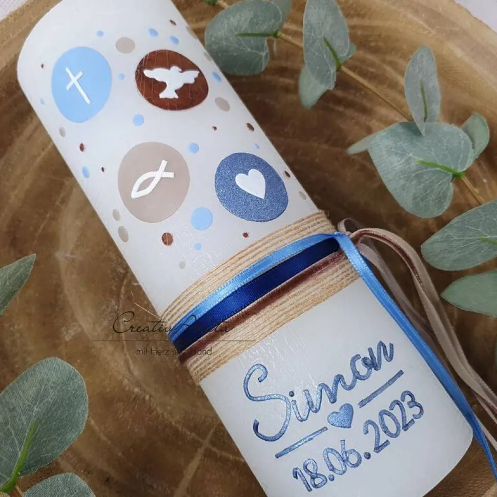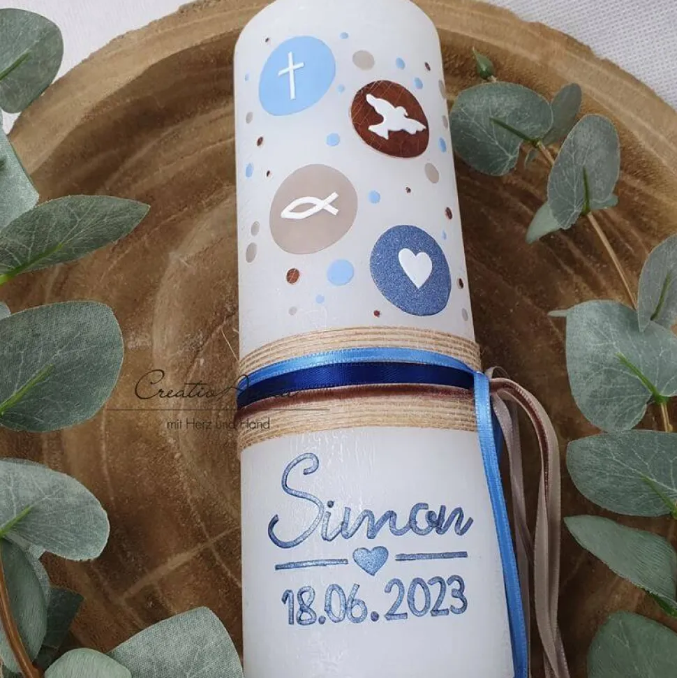 Gerne personalisieren wir die Kerze auch mit dem Namen des Täuflings und das Taufdatum.
