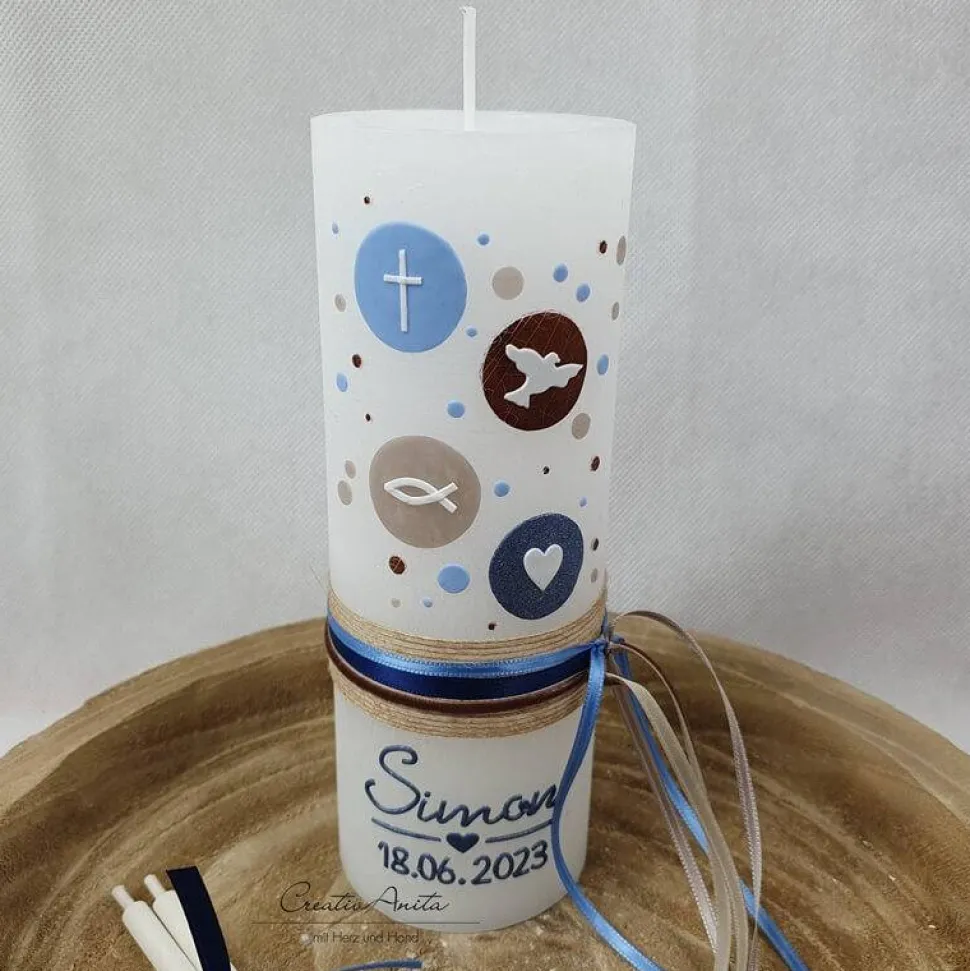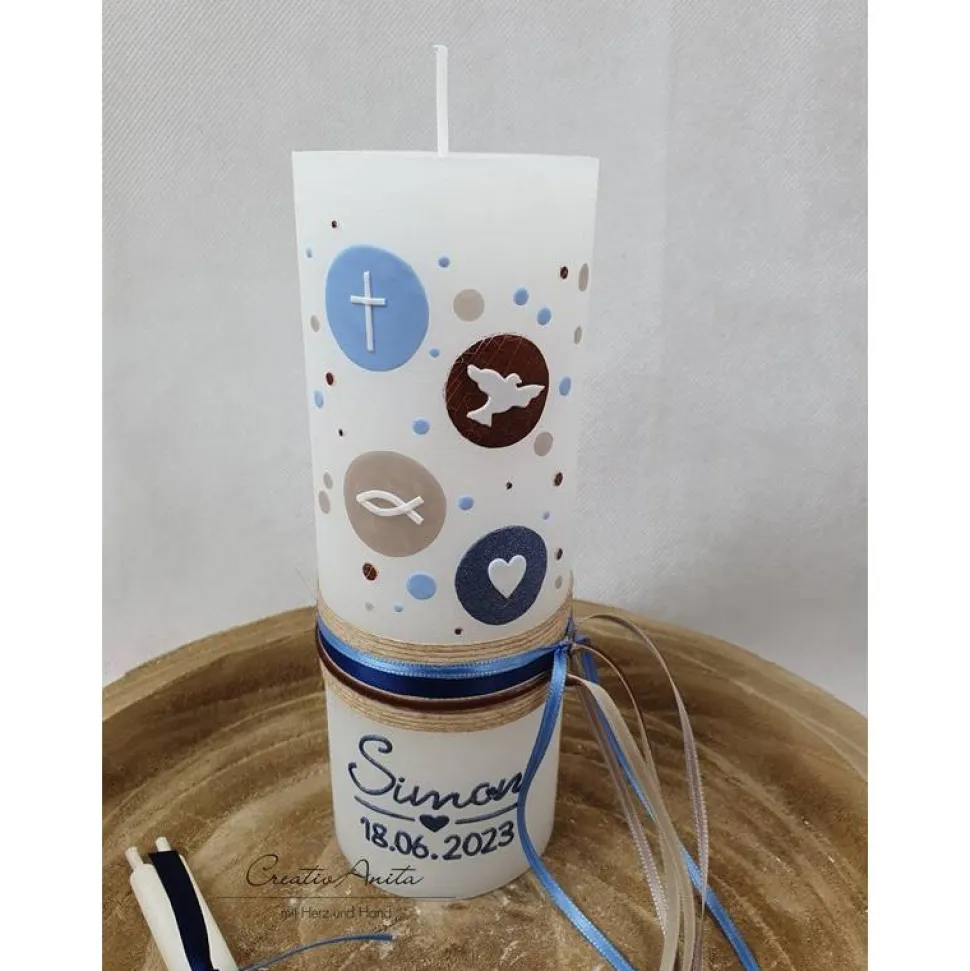 Tolle Taufkerze – Rustikkerze in Weiß mit verschieden großen Kreisen in den Farben hellblau, taupe, blau metallic und holzoptik.