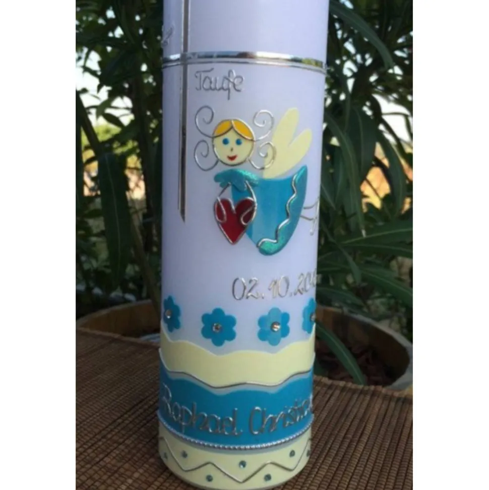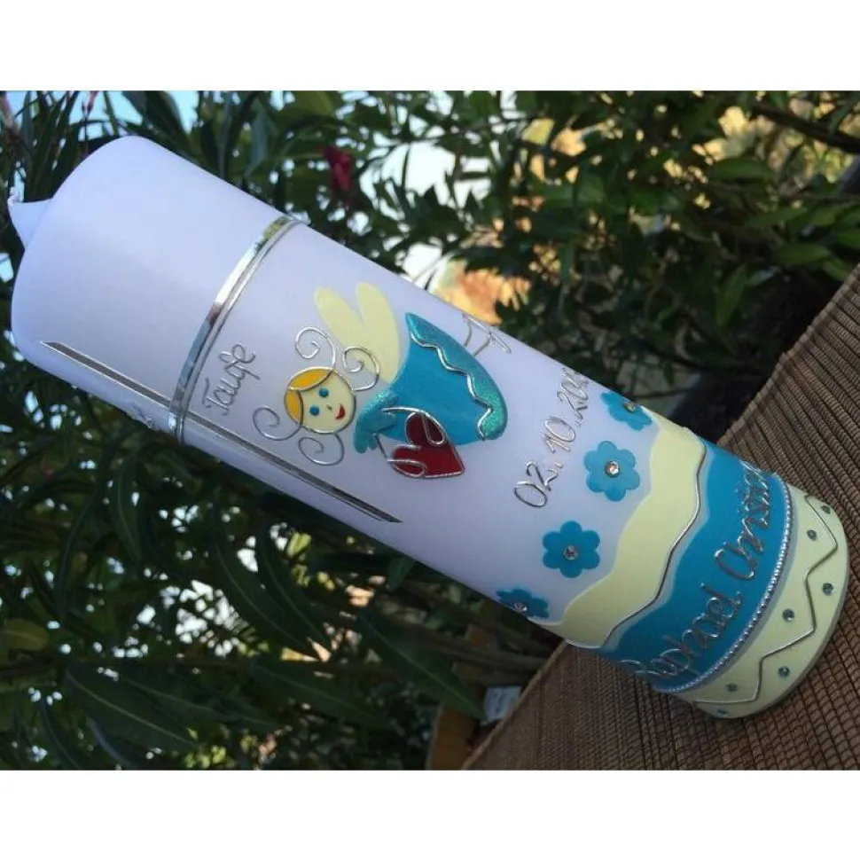 Taufkerze Schutzengel mit hochwertigen Wachsverzierungen