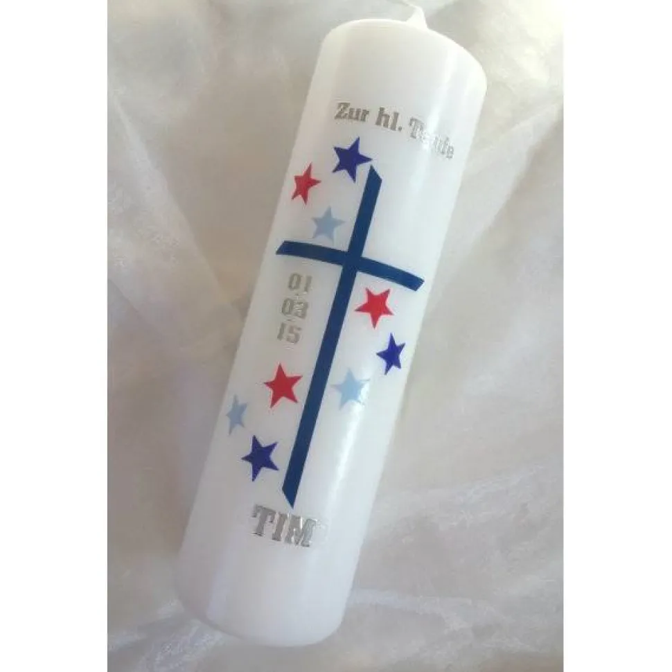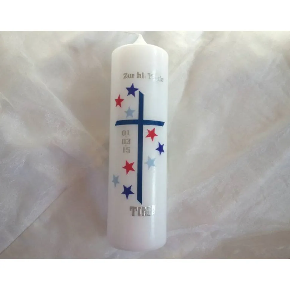 Die Taufkerze hat eine Höhe von 25cm und einen Durchmesser von 6cm. Das dunkelblaue Kreuz wird von Sternen in rot, blau und hellblau gerahmt und gibt der Kerze dadurch einen maritimen Touch.