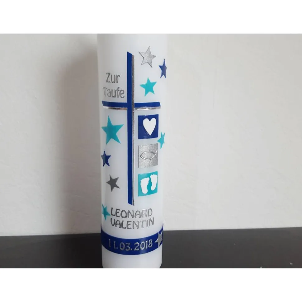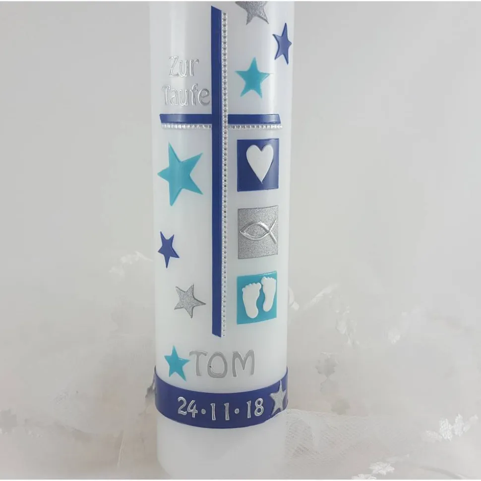 die Sterne runden das Motiv ab und geben der Taufkerze einen sehr modernen Touch