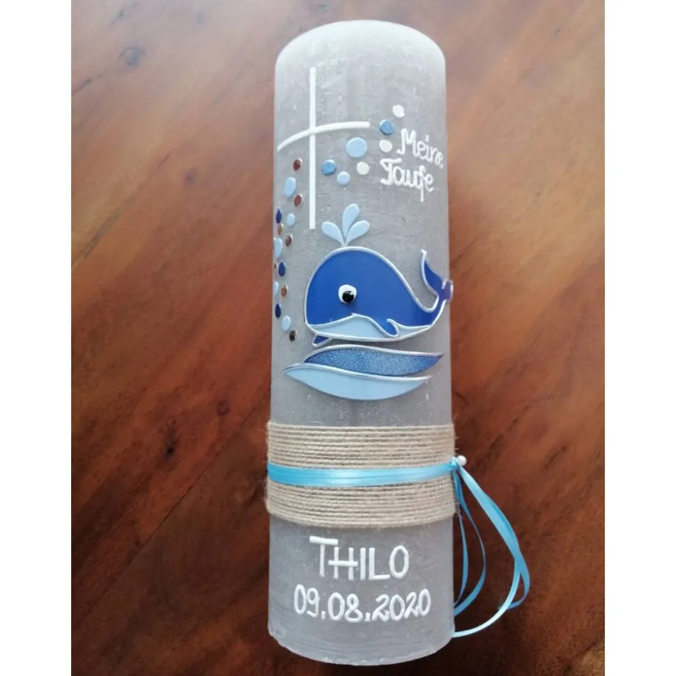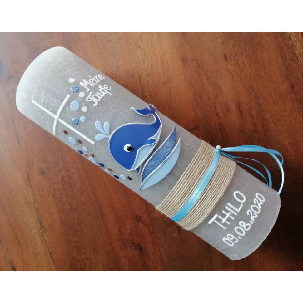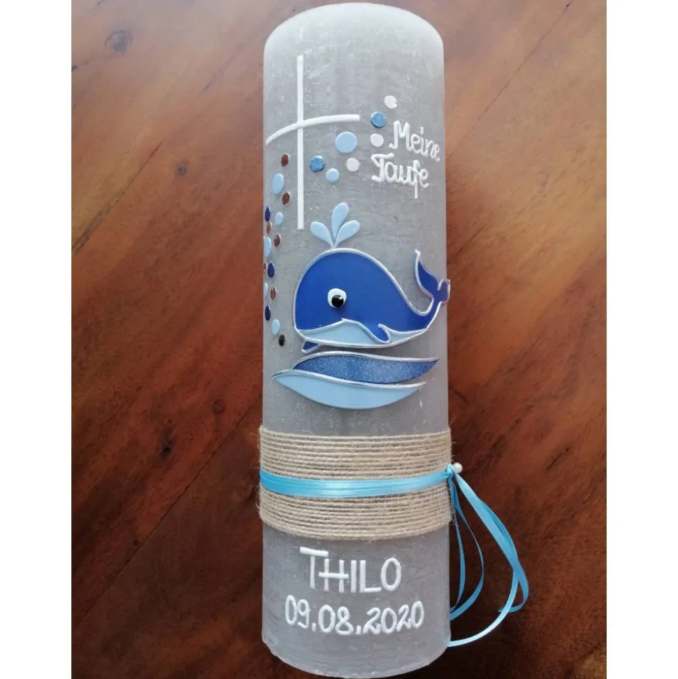 Taufkerze Wal – Fisch – mit hochwertigen Wachsverzierungen