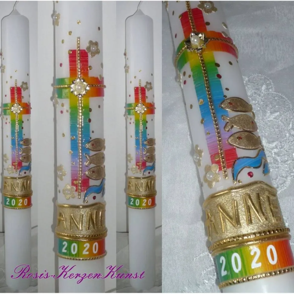Im Mittelpunkt des Motivs steht das Kreuz welches wir in den typischen Regenbogenfarben gestaltet haben. Weitere christliche Elemente, die die Kerze schmücken, sind das Fisch- und Wassersymbol. Die Regenbogenfarben werden durch goldfarbenes Wachs verstärkt und ergeben eine harmonische farbenfrohe Farbgestaltung dieser Kerze.