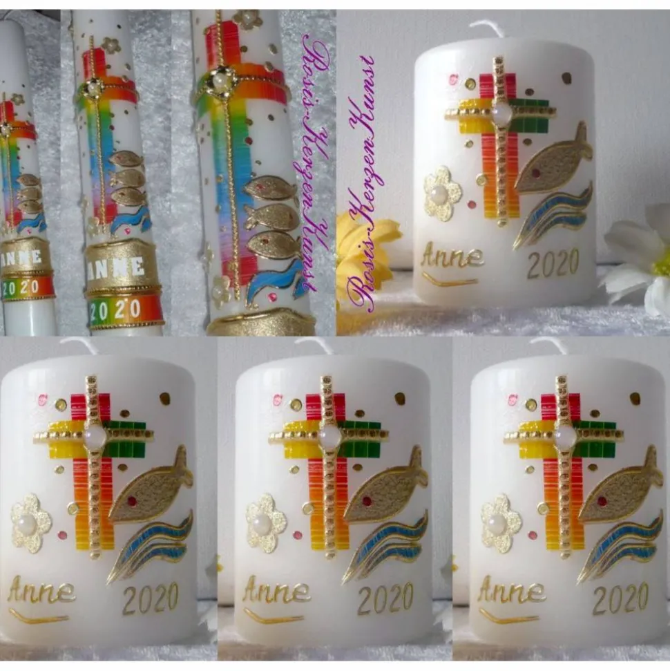 Bei dem angebotenen SET handelt es sich um eine lange farbenfroh gestaltete Tauf-oder Kommunionskerze mit Kreuz-Symbol in Vollwachsauflage.und 6 Stck passende Gastgeschenke-Kerzchen als kleines Dankeschön und zur Erinnerung für Ihre Gäste.
