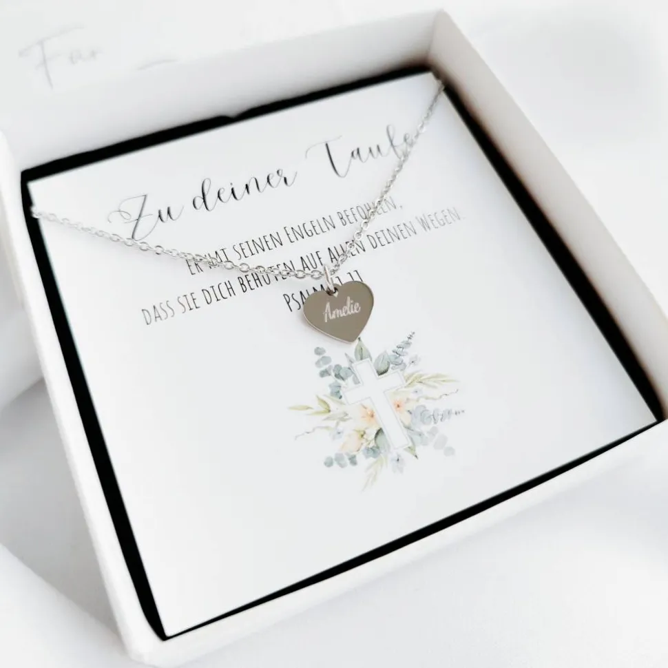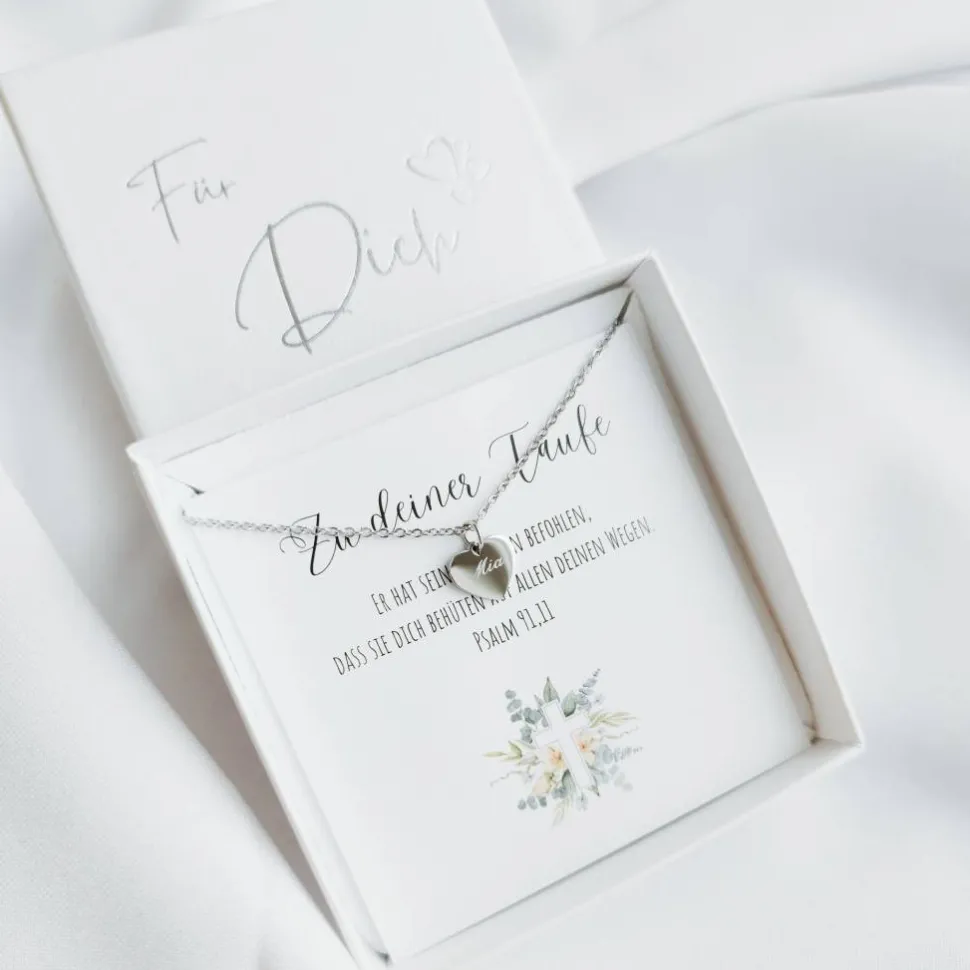 Du suchst nach einem personalisierten Geschenk zur Taufe für Mädchen oder Jungen? Diese hochwertige Kette aus 316L Edelstahl mit einem personalisierten Herz Anhänger mit Gravur wird dem Taufkind und den Eltern ein strahlendes Lächeln auf die Lippen zaubern.