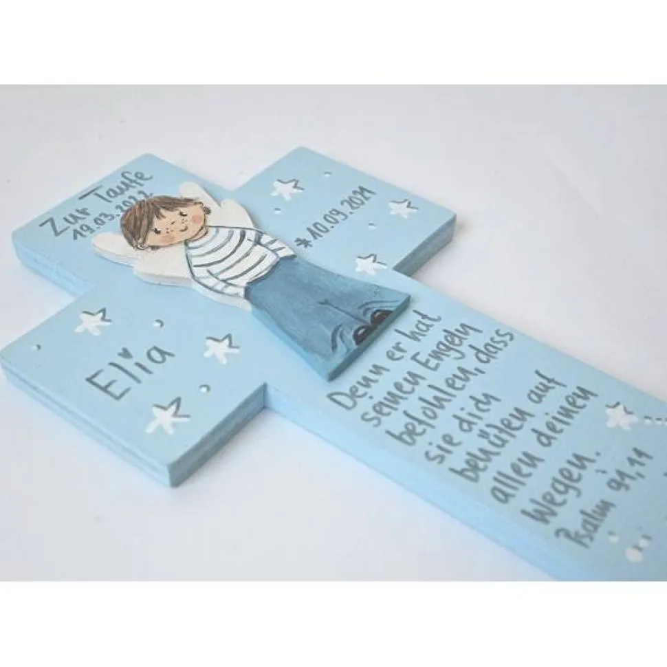 Jedes Taufkreuz wird individuell nach Ihren Wünschen gestaltet. Es wird von Hand ausgesägt und mit hochwertigen Künstleracrylfarben vorder- und rückseitig bemalt. Kein Druck, kein Laser, kein Kleben – nur echte Handarbeit mit viel Liebe zum Detail! Der Schutzengel wird separat gefertigt und aufgeklebt, Ihr Wunsch-Schutzengelspruch wird in Handschrift angebracht.