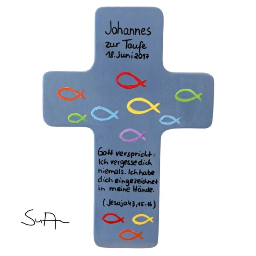 Kreuz mit christlichem Motiv: Fische in Regenbogenfarben