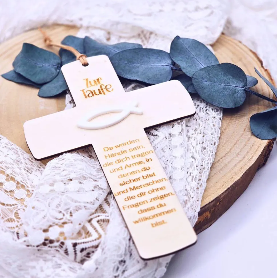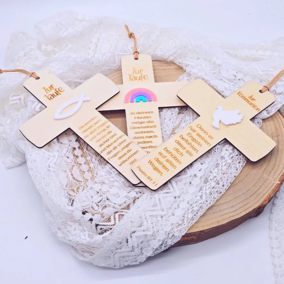 Ein liebevoll gestaltetes Holzkreuz zur Taufe, Kommunion oder auch als Erinnerung an einen besonderen Segensmoment im Leben. Jedes Kreuz wird von Hand aus hochwertigem Holz gefertigt, graviert und mit einem 3D-Motiv aus Acyrl wie Fisch, Taube oder Regenbogen versehen.