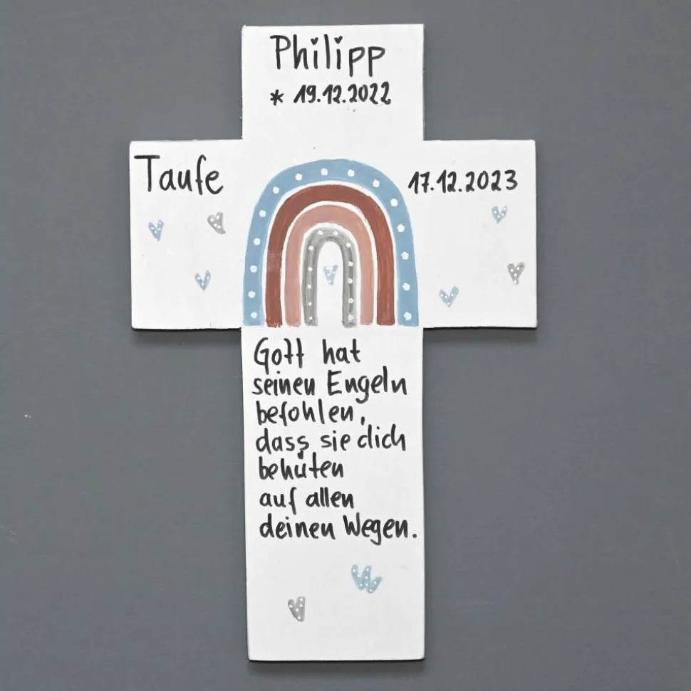 Entdecke das einzigartige Taufkreuz mit Regenbogenmotiv – liebevoll handgemacht und individuell nach deinen Wünschen gestaltet. Jedes Kreuzchen ist ein echtes Unikat, das mit viel Sorgfalt von Hand ausgesägt und mit hochwertigen Künstleracrylfarben in deiner Wunschfarbe grundiert wird. Das Motiv wird anschließend frei Hand aufgemalt und dein persönlicher Wunschtext handschriftlich hinzugefügt.