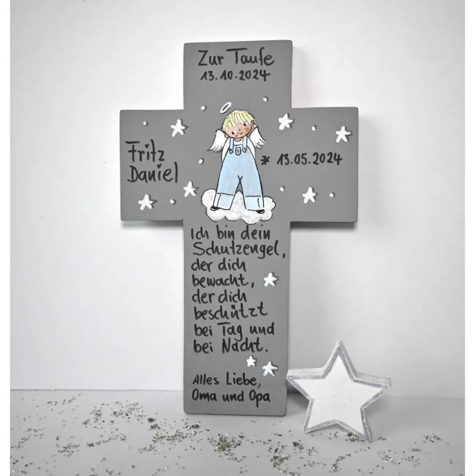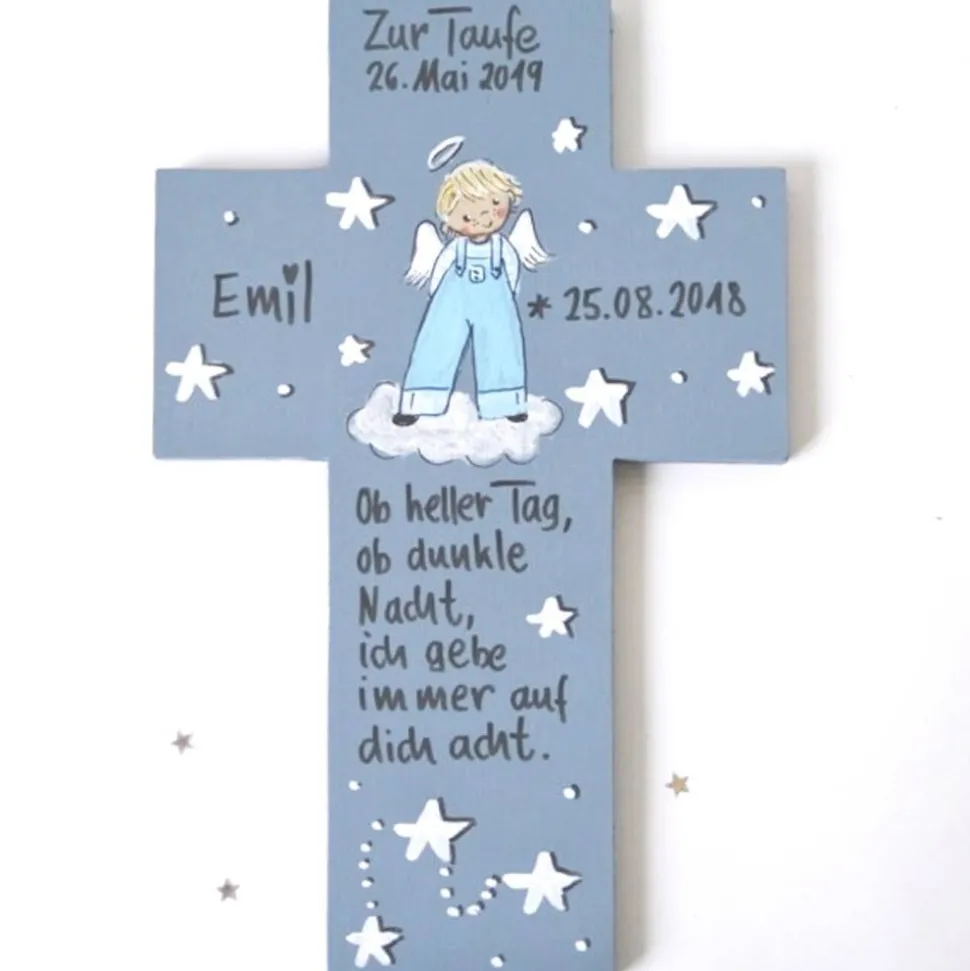 Der Wunschengel und dein persönlicher Schutzengelspruch werden sorgfältig von Hand aufgemalt und handschriftlich angebracht. Für besondere Langlebigkeit wird das Kreuz zweifach mit Acryllack versiegelt. Dein Taufgeschenk wird versandkostenfrei im Luftpolsterumschlag geliefert.