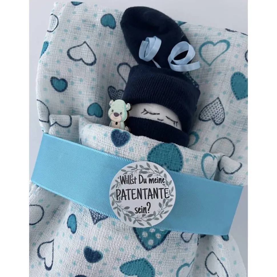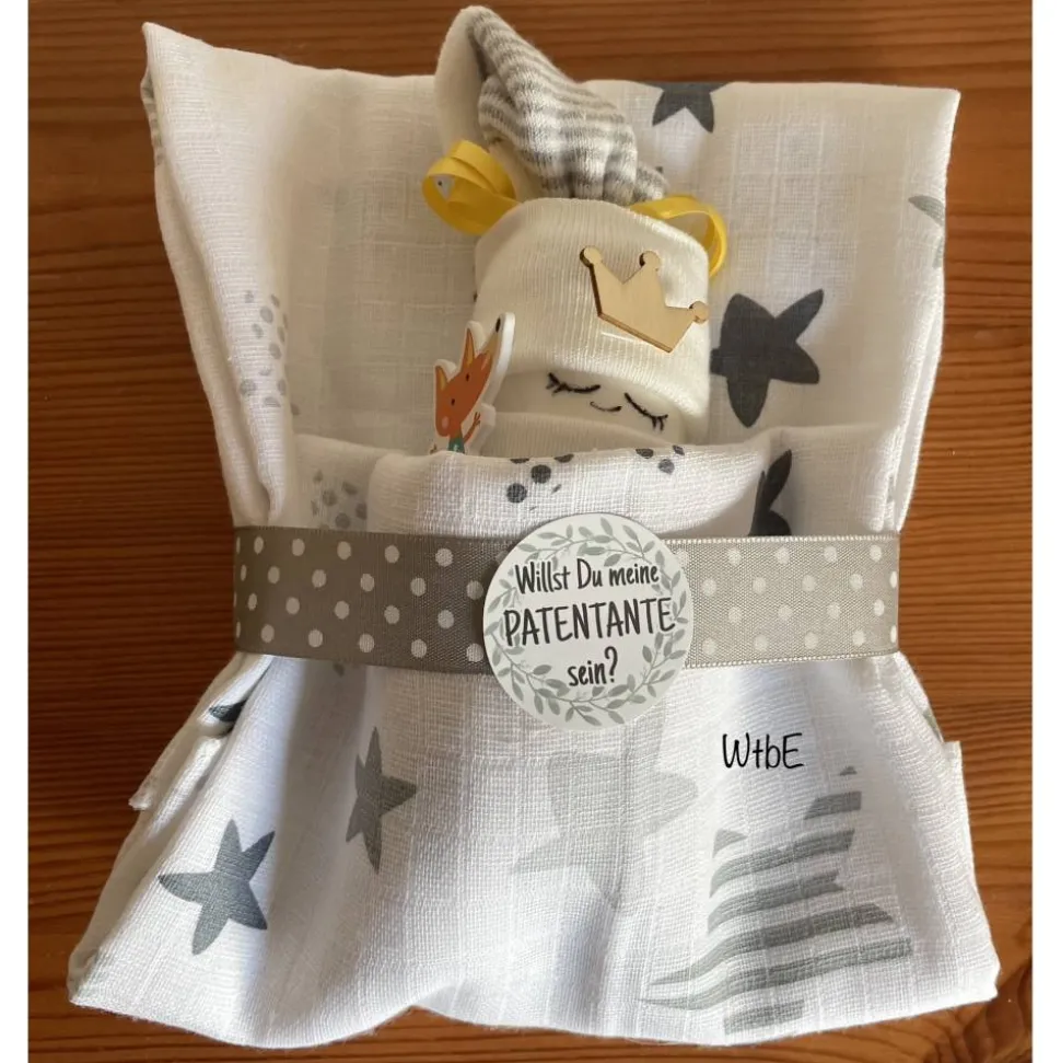 Das Willst Du meine Patentante sein – Geschenk besteht aus: 1 Paar Babysöckchen, 1 Mullwindel ca. 70 x 80 cm, 1 Marken-Windel, 1 Sticker: Willst Du meine Patentante sein, 1 Kuscheltier-Sticker, Dekobänder