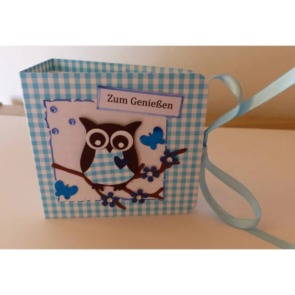 Die Vorderseite ist mit eine gestanzten Eule verziert