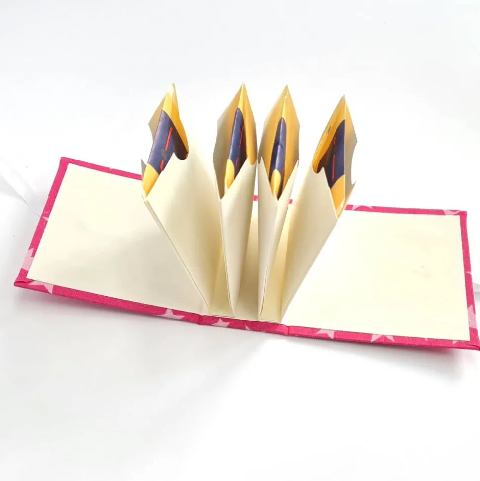 Die Hardcover-Decke des Teebeutelbuches besteht aus 1,5mm Buchbindergraupappe, überzogen mit einem hübschen Baumwollstoff mit Sternen. So kann in der Handtasche auch ruhig mal etwas schwereres darauf liegen, es verknickt nichts.