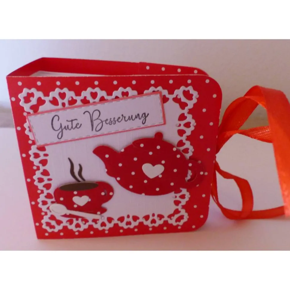 und mit dem Spruch, Gute Besserung und einer Tasse und Teekanne verziert.