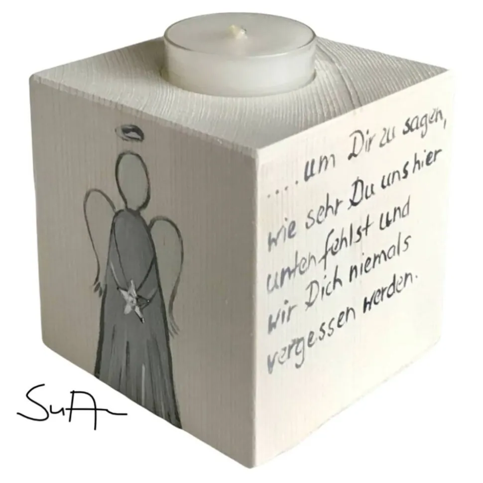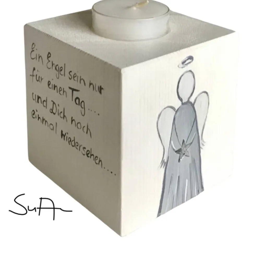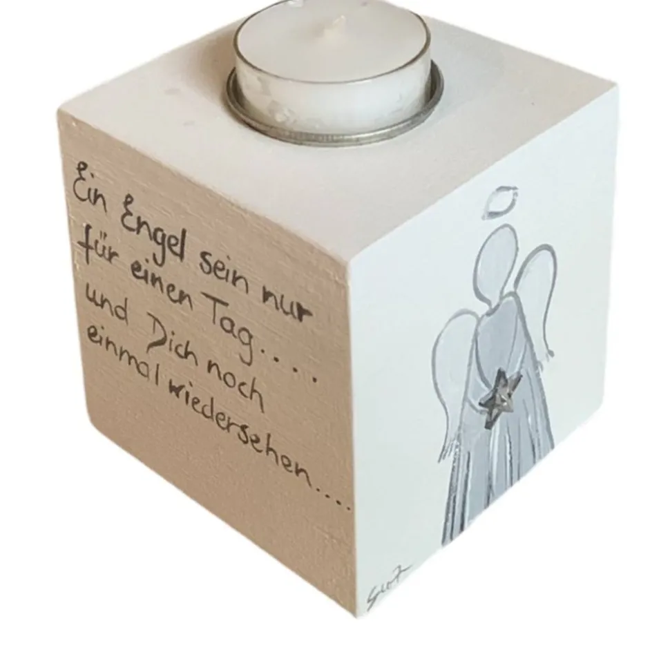 Jeder Kerzenwürfel wird nach dem Kauf individuell für Sie bemalt. Die Teelichthalter können mit Namen,Daten, christlichem oder persönlichem Vers personalisiert werden. Farbwünsche werden gerne berücksichtigt.