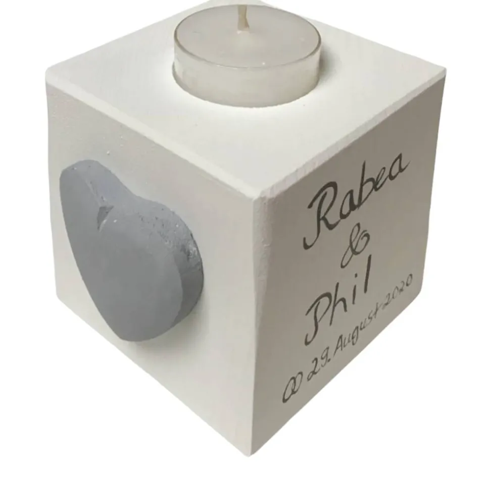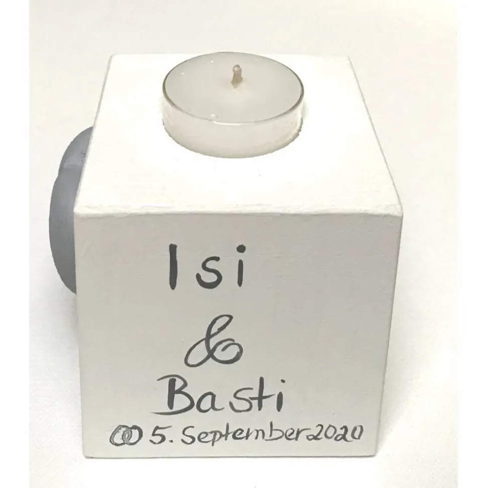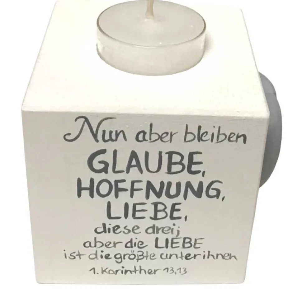Jeder Kerzenwürfel wird nach dem Kauf individuell für Sie bemalt. Die Teelichthalter können mit Namen,Daten, christlichem oder persönlichem Vers personalisiert werden. Farbwünsche werden gerne berücksichtigt.